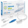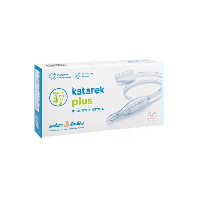 Aspirator kataru Katarek Plus to innowacyjne urządzenie do walki z katarem u dzieci, które jest podłączane do domowego odkurzacza. Wykorzystując jednostajną siłę ssącą odkurzacza aspirator Katarek Plus skutecznie i szybko usuwa wydzielinę z noska dziecka, przynosząc mu ulgę. Cały proces odciągania wydzieliny jest całkowicie bezpieczny dla każdego dziecka, już od pierwszych dni życia. Aspirator Katarek Plus posiada rozkręcaną komorę, dzięki czemu utrzymanie go w czystości nie sprawia żadnych problemów. Aspirator kataru Katarek Plus posiada dwie końcówki pozwalające na stosowanie go u dwójki dzieci jednocześnie. Zastosowany na końcówkach systemem identyfikacji „Ja&Ty” (buzia niebieska, buzia różowa) umożliwia ich rozróżnienie. W komplecie znajduje się także szczoteczka, która służy do czyszczenia komory i końcówek i którą można wyparzać. Aspirator Katarek Plus dedykowany jest nie tylko dla małych dzieci, ale doskonale sprawdza się również u osób niepełnosprawnych, gdzie wspomaga codzienną ich pielęgnację.