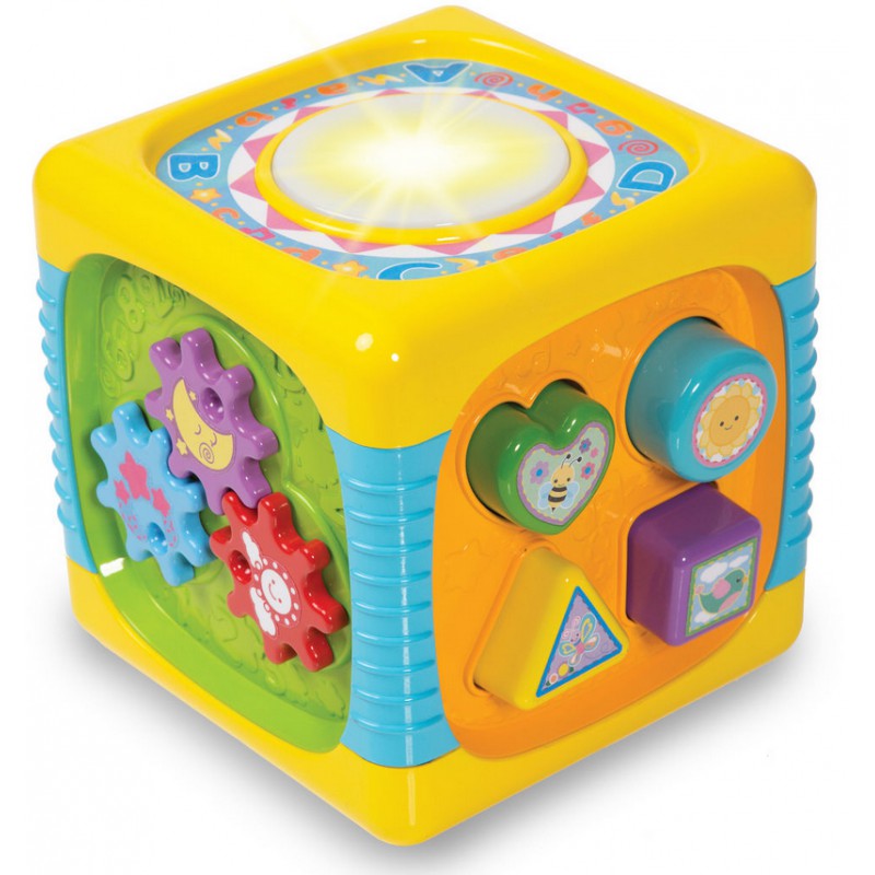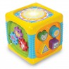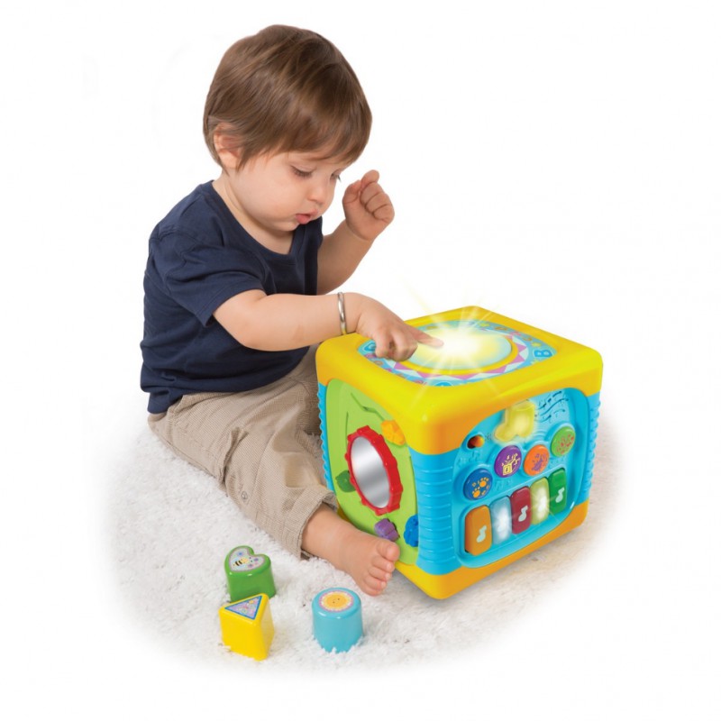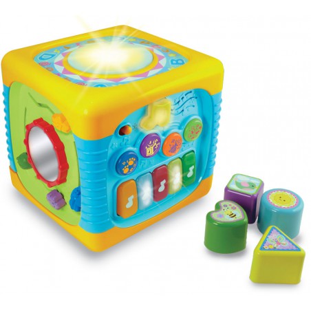 Ta interaktywna kostka do zabawy pozwala na poznanie nowych dźwięków i odgłosów (np. zwierząt). Zawiera pianinko, na którym maluch może odgrywać własne, nieskomplikowane kompozycje. Ma również wbudowany bębenek, który zmienia kolor, gdy się w niego uderzy. Ponadto zawiera przyciski, które pozwalają na zmianę grających na pianinku instrumentów czy innych dźwięków. Każdy z tych elementów doskonale rozwija zmysł słuchu.