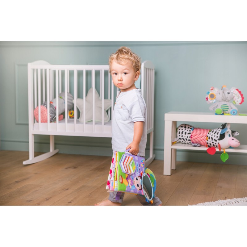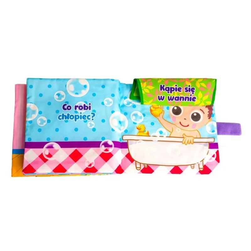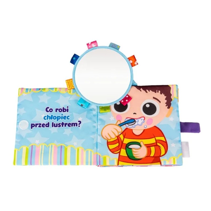 Bohaterem tej książeczki jest chłopiec, który wykonuje swoje codzienne czynności. Poznaj je, odkrywając każdą z kolorowych stron! Znajdziemy tu różne dodatkowe elementy, w postaci piszczałki, bezpiecznego lusterka do samopoznania dziecka oraz szeleszczących łatek, które uatrakcyjnią zabawę, rozwijając zdolności poznawcze dziecka. Książeczka została wyposażona również w praktyczne zapięcie na rzep oraz uchwyt, znajdujący się na grzbiecie.