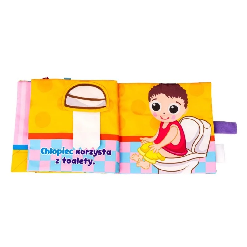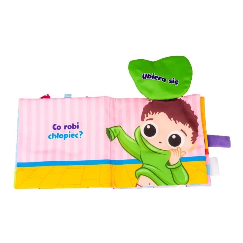 Bohaterem książeczki jest chłopiec, który wykonuje swoje codzienne czynności. Znajdziemy tu różne dodatkowe elementy, w postaci piszczałki, bezpiecznego lusterka do samopoznania dziecka oraz szeleszczących łatek, które uatrakcyjnią zabawę, rozwijając zdolności poznawcze dziecka. Książeczka została wyposażona również w praktyczne zapięcie na rzep oraz uchwyt, znajdujący się na grzbiecie.
