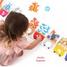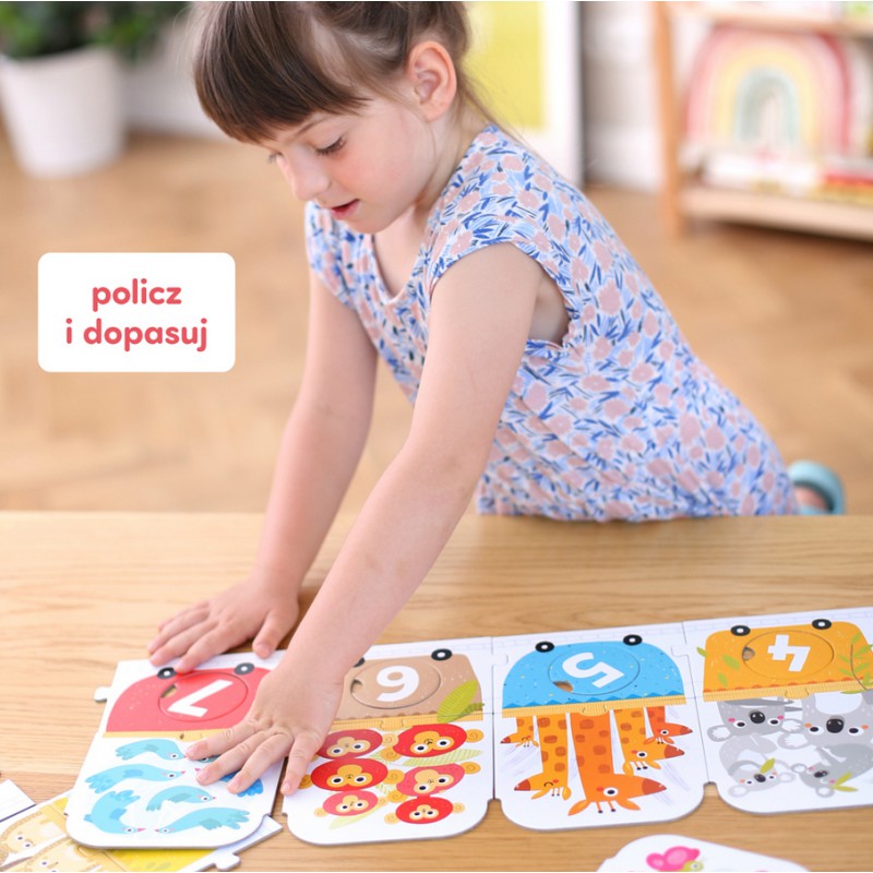 Przedszkolak interesuje się otaczającym go światem i zadaje mnóstwo pytań. Jest gotowy na nowe wyzwania, na przykład na zabawy z liczbami! Ułóżcie wspólnie puzzlowy pociąg. Policzcie podróżników, nazywajcie zwierzątka, kolory i cyfry. Następnie dopasujcie kółeczka z liczbami do odpowiednich dziurek. Może posadzicie pasażerów w dowolnej kolejności, a następnie na nowo dopasujecie liczby? Aby podsunąć wam pomysły na edukacyjne zabawy, do puzzli dołączyliśmy poradnik ze scenariuszami zabaw. Możecie je łatwo dostosować do wieku i umiejętności dzieci.