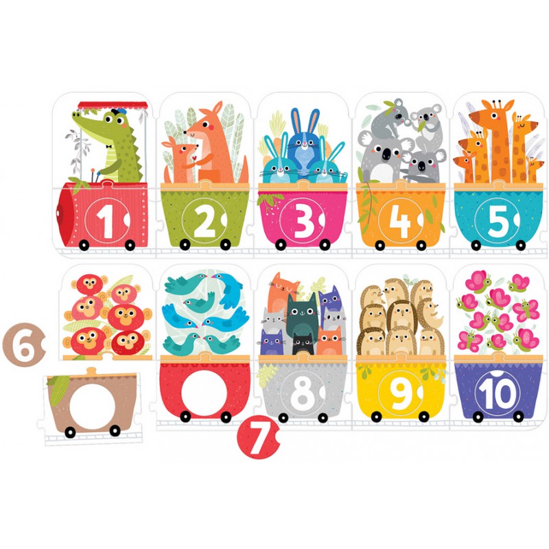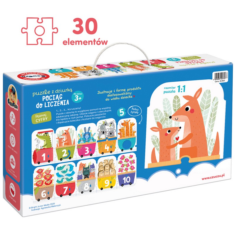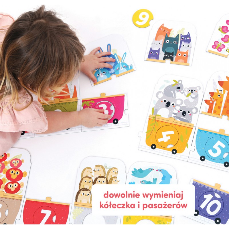 Edukacyjna panoramiczna układanka przedstawia długi pociąg i jego pasażerów. Składa się z 30 elementów: 20 tradycyjnych puzzli i 10 wyjmowanych kółeczek z cyframi, które należy dopasować do odpowiednich dziurek.