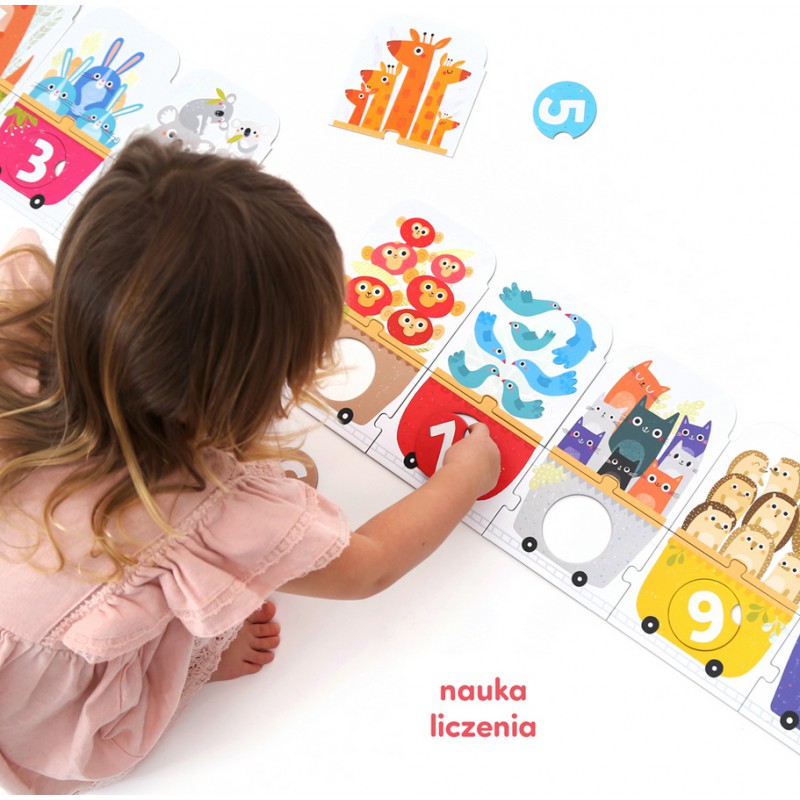 Dajcie się porwać kreatywnej zabawie. Ułożenie pociągu i liczenie do 10 to początek wspaniałej przygody: do zestawu dołączyliśmy poradnik, który jest kopalnią pomysłów na rozwijające zabawy. Puzzle to doskonały pomysł na prezent dla ciekawego świata przedszkolaka. Dzieci potwierdzają: liczenie to świetna zabawa!