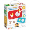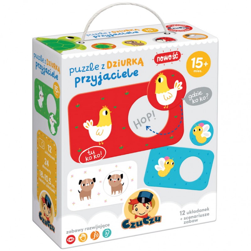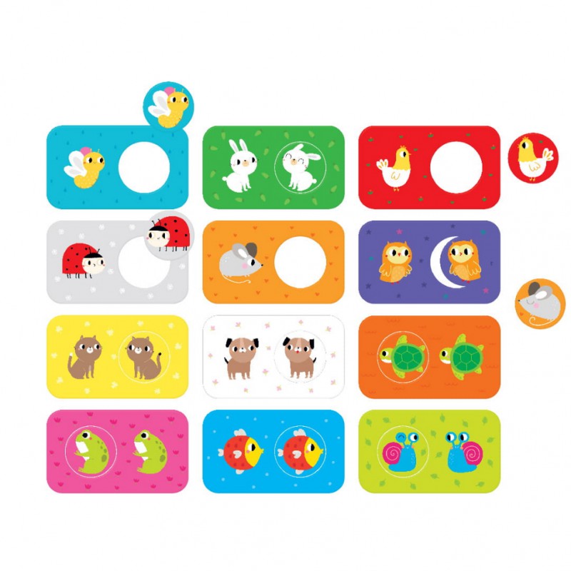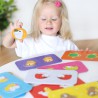 Edukacyjne pierwsze puzzle Malucha, składają się z 12 dużych dwuelementowych układanek. Zabawa polega na dopasowaniu wyjmowanych dwustronnych kółeczek.