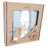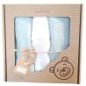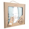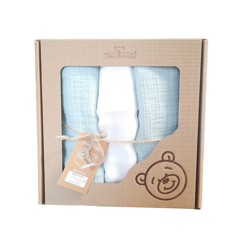 Zestaw zawiera 3 szt. pieluszek: 2 szt. muślinowe są barwione jednolicie w kolorze miętowym, trzecia jest biała tetrowa.