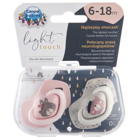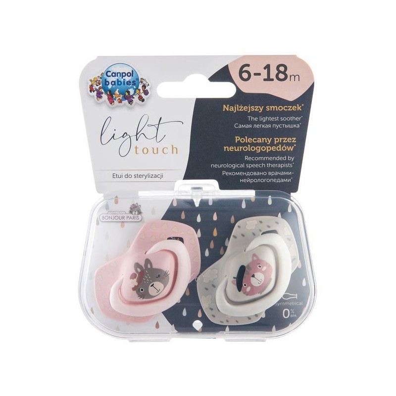 Rekomendowany przez specjalistów jako pierwszy smoczek Twojego Maluszka.* Smoczki Light touch stworzono by zapewnić maksymalny komfort najmłodszym dzieciom. Ich wyjątkowo miękka silikonowa gumka wymaga mniej wysiłku podczas ssania, a lekka, profilowana tarczka nie obciąża zgryzu i gwarantuje swobodne oddychanie, co według specjalistów ma istotny wpływ na prawidłowy rozwój jamy ustnej dziecka.** Wygodny uchwyt smoczka pozwala na przymocowanie łańcuszka i ułatwia podanie go dziecku. Smoczki Light touch z łatwością utrzymasz w czystości, dzięki nowoczesnemu etui, które może służyć do przechowywania, ale też do szybkiej i wygodnej dezynfekcji w kuchence mikrofalowej. Wystarczy odrobina wody i 2 minuty by zapewnić smoczkom higieniczną czystość. Smoczki Light touch dostępne są w kilku wyjątkowych, inspirowanych najnowszymi trendami kolekcjach i różnych rozmiarach – rosną razem z Twoim Maluszkiem.