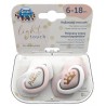 Rekomendowany przez specjalistów jako pierwszy smoczek Twojego Maluszka.* Smoczki Light touch stworzono by zapewnić maksymalny komfort najmłodszym dzieciom. Ich wyjątkowo miękka silikonowa gumka wymaga mniej wysiłku podczas ssania, a lekka, profilowana tarczka nie obciąża zgryzu i gwarantuje swobodne oddychanie, co według specjalistów ma istotny wpływ na prawidłowy rozwój jamy ustnej dziecka.** Wygodny uchwyt smoczka pozwala na przymocowanie łańcuszka i ułatwia podanie go dziecku. Smoczki Light touch z łatwością utrzymasz w czystości, dzięki nowoczesnemu etui, które może służyć do przechowywania, ale też do szybkiej i wygodnej dezynfekcji w kuchence mikrofalowej. Wystarczy odrobina wody i 2 minuty by zapewnić smoczkom higieniczną czystość. Smoczki Light touch dostępne są w kilku wyjątkowych, inspirowanych najnowszymi trendami kolekcjach i różnych rozmiarach – rosną razem z Twoim Maluszkiem.