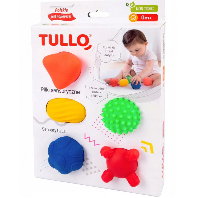 Piłki sensoryczne Tullo to idealny sposób na rozwój dziecka poprzez dotykanie. Działają na każdy zmysł dziecka. Wyraziste kolory angażują wzrok rozmiar pozwala na chwytanie piłeczek w różny sposób, dzięki czemu dziecko czuje pod paluszkami różne faktury które znajdują się na piłeczkach. Każda piłeczka różni się od siebie przez co dziecko szuka podobieństw i różnic. Dodatkowym atutem piłeczek sensorycznych jest to, że maja wszechstronne zastosowanie. Nadają się do masażu co rozluźnia napięcie mięśniowe. Sprawdzają się również podczas ząbkowania. Piłeczki są bardzo bezpieczne nie zawierają ftalanów , BPA, metali ciężkich. Wykonane w 100% w Polsce.