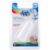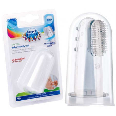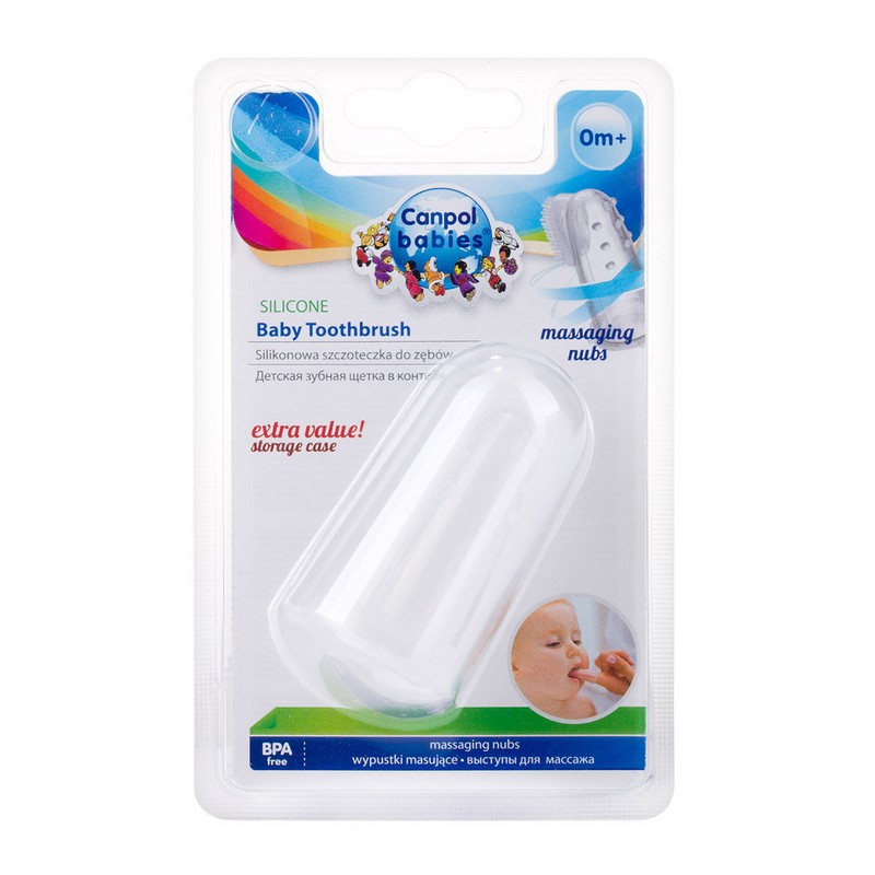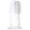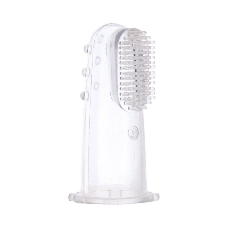 Miękka szczoteczka z wypustkami nakładana na palec idealnie nadaje się do mycia pierwszych ząbków. Wykonana została z silikonu wolnego od BPA. Można ją stosować u dzieci, które jeszcze nie mają ząbków do masażu i codziennej higieny dziąsełek. Umożliwia delikatne czyszczenie bez ryzyka ich uszkodzenia. Konstrukcja szczoteczki umożliwia dotarcie w trudno dostępne miejsca. W zestawie higieniczny pojemnik do przechowywania.
