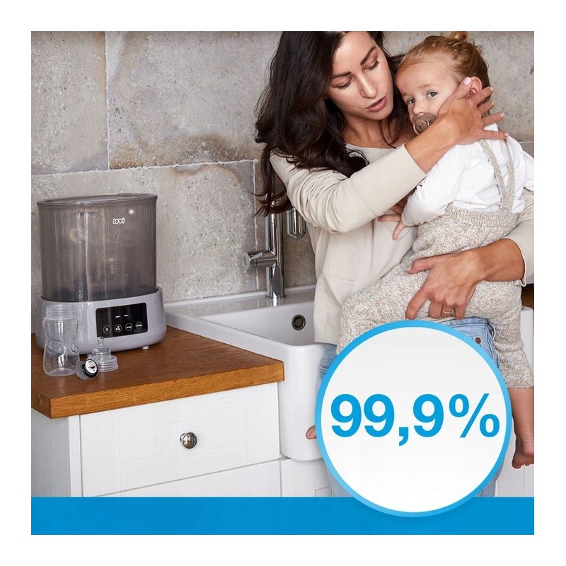 Innowacyjne połączenie sterylizatora z suszarką, dzięki czemu butelki i smoczki są szybko czyste, suche i bezpieczne dla dziecka
