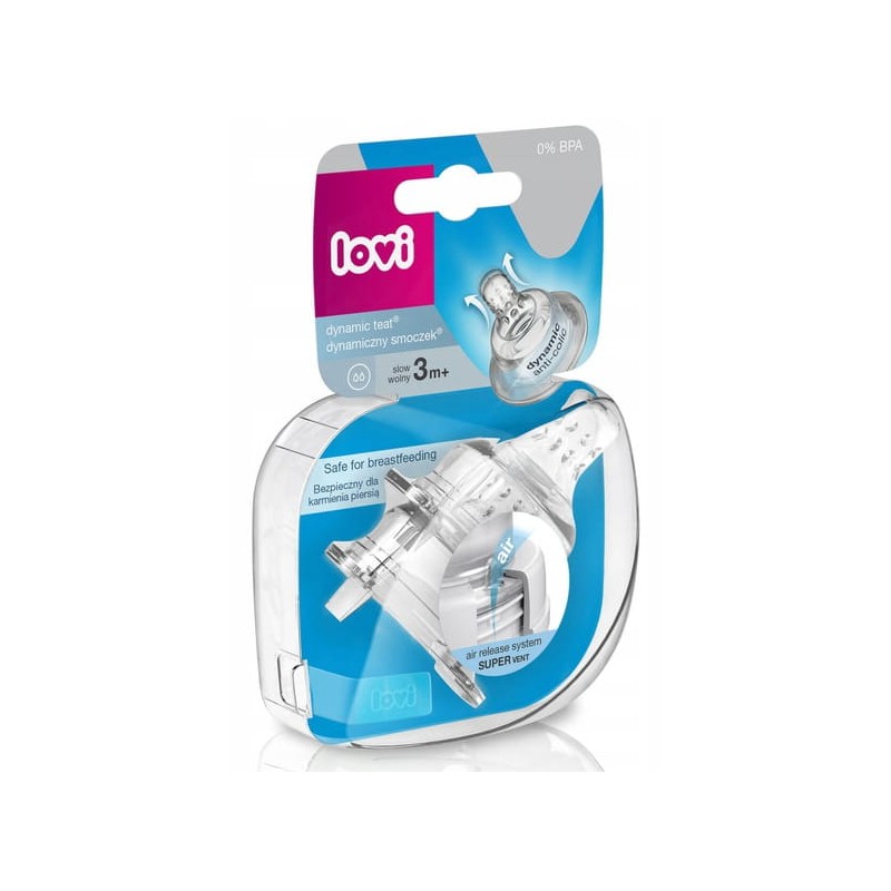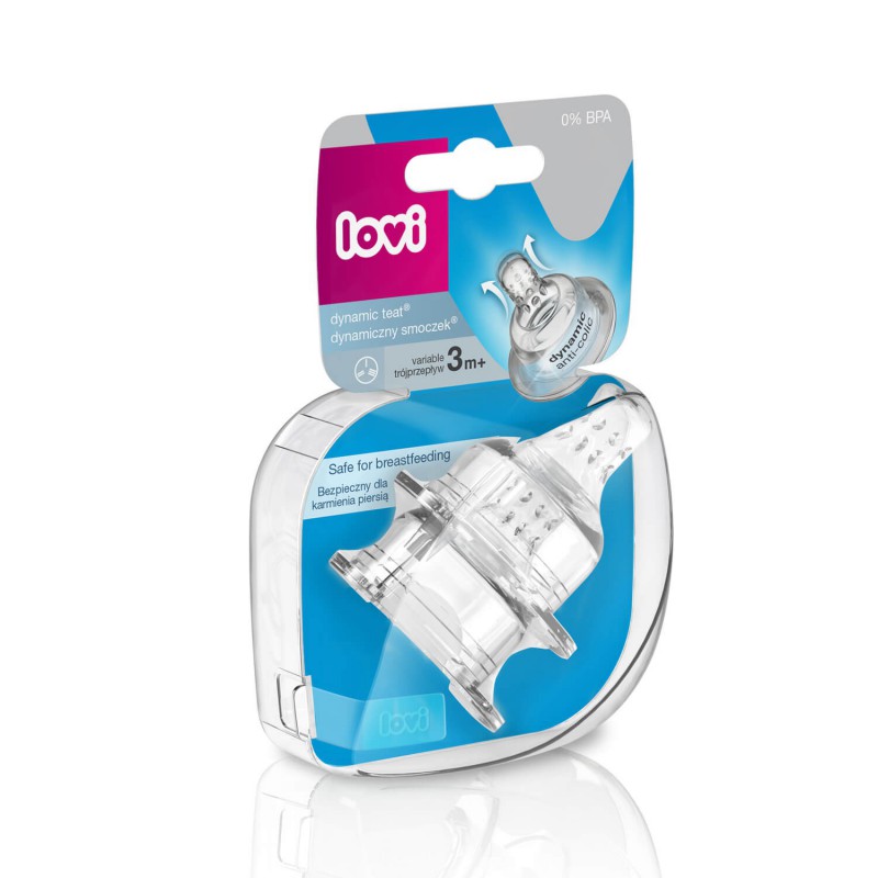 Dynamiczny trójprzepływowy smoczek LOVI do podawania odciągniętego mleka mamy to efekt pracy neurologopedów. Jest zbudowany z niejednorodnych warstw silikonu: miękkiej, cienkiej, wydłużającej się końcówki i szerokiej, twardej, profilowanej podstawy. Dzięki temu nie zaburza odruchu ssania i nie koliduje z karmieniem piersią. Smoczek ten ma możliwość ustawienia przepływu mleka. W zależności jak się go ustawi względem noska dziecka, pokarm płynie większym bądź mniejszym strumieniem.