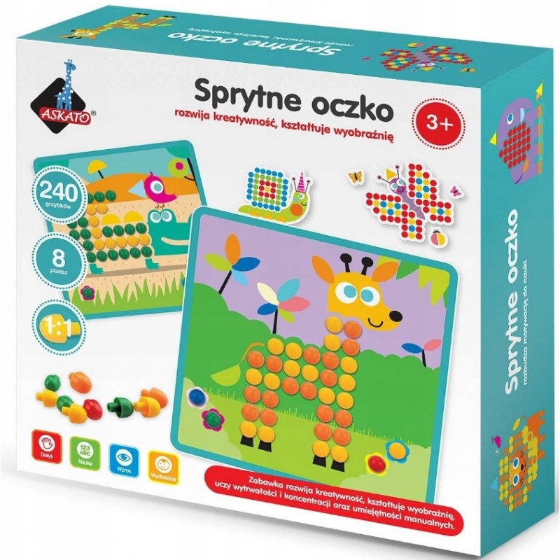 Mozaika SPRYTNE OCZKO to zabawka edukacyjna dedykowana dzieciom w wieku przedszkolnym, która rozwija kreatywność i kształtuje wyobraźnię. Wyposażona w 8 szablonów i 240 pinezek mozaika doskonali funkcje poznawcze naszych pociech w sposób i przyjemny i ciekawy.