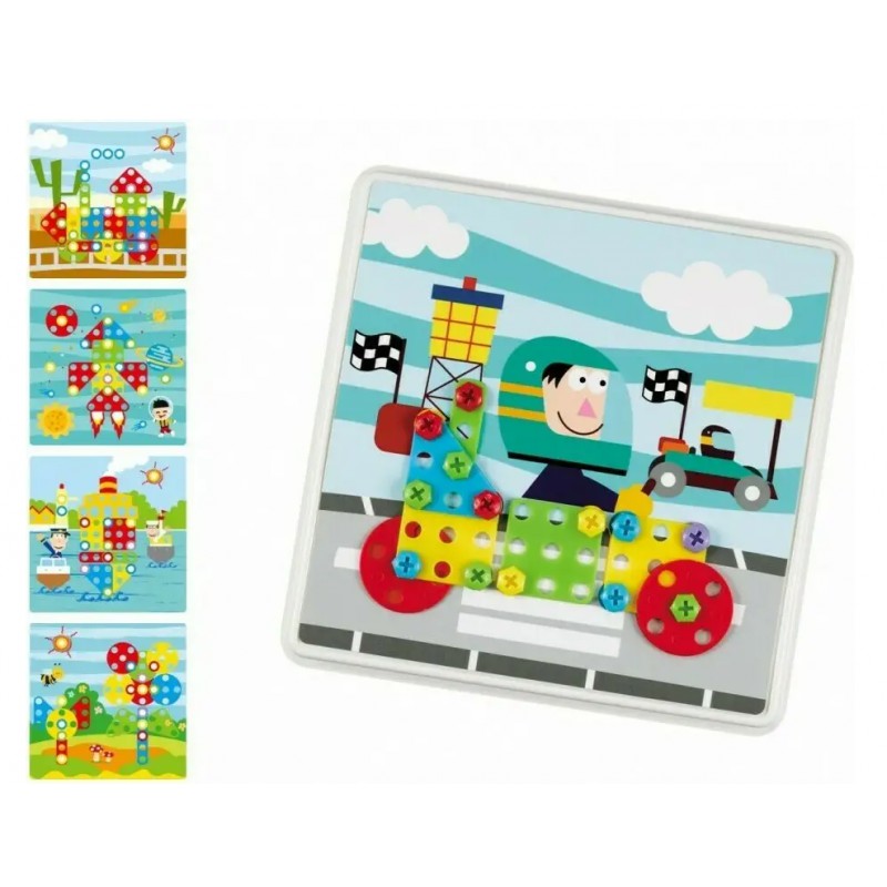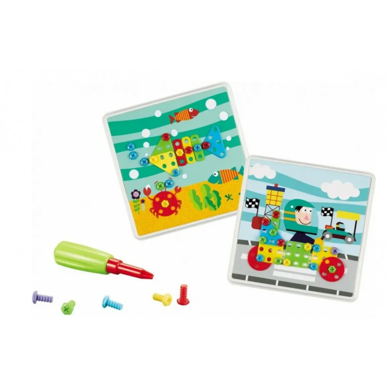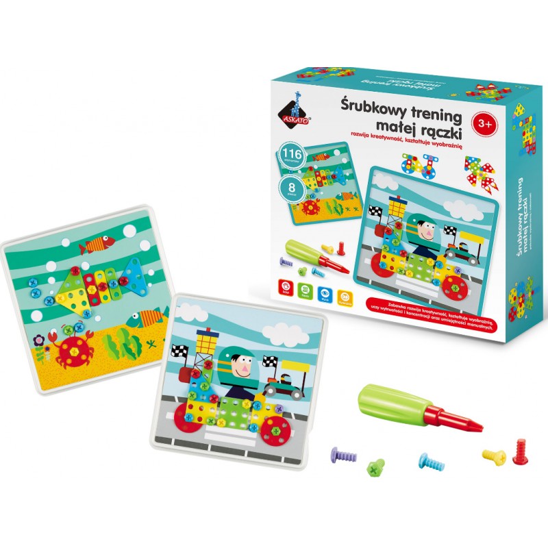 Zestaw składa się z 8 szablonów, dzięki którym dzieci ćwiczą odwzorowywanie czyli analizę i syntezę wzrokową. Ćwiczą kategoryzację i sekwencję poprzez dobór różnych kształtów, figur i kolorów śrubek. Poprzez dokręcanie według schematu dzieci ćwiczą układanie elementów od lewej do prawej strony. Mozaika jest propozycją dla dzieci w wieku przedszkolnym, dzięki której proces nauki pisania będzie łatwiejszy. Pisanie jest procesem wymagającym prawidłowej koordynacji wzrokowo-ruchowej oraz precyzji ruchów - to wszystko umożliwia śrubowy trening małej rączki. Funkcje te dzieci mogą rozwijać dzięki odpowiednim ćwiczeniom grafomotorycznym.