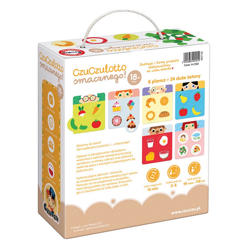 Pełne kolorów i humoru ilustracje przedstawiają różnorodne potrawy i smakołyki. Zanim maluch opanuje reguły gry, możecie bawić się na różnorodne sposoby dostosowane do umiejętności dziecka. Co więcej, w zestawie znajdziecie poradnik pełen pomysłów na edukacyjne zabawy. Skorzystajcie z naszych podpowiedzi, by w pełen frajdy sposób uczyć się i rozwijać zmysły: wzrok, dotyk, słuch oraz węch i smak. CzuCzulotto doskonały pomysł na grę dla całej rodziny.