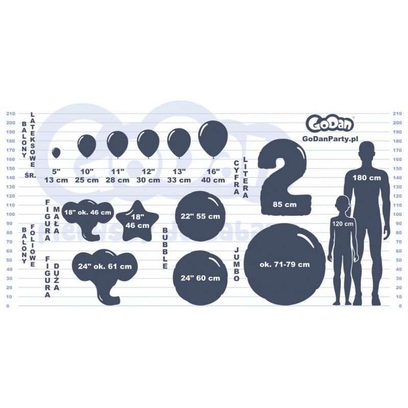 - Rozmiar w centymetrach: 60 cm (wózek), 45 cm (pozostałe balony)