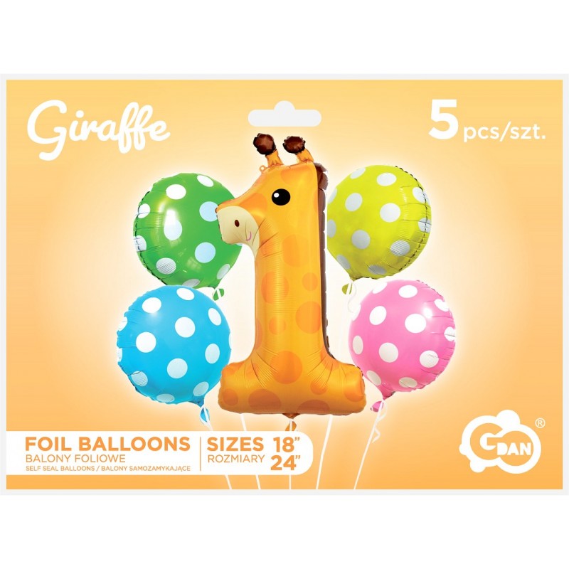- Rozmiar w centymetrach: 60 cm (cyfra 1 żyrafa), 45 cm (balony w groszki)