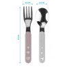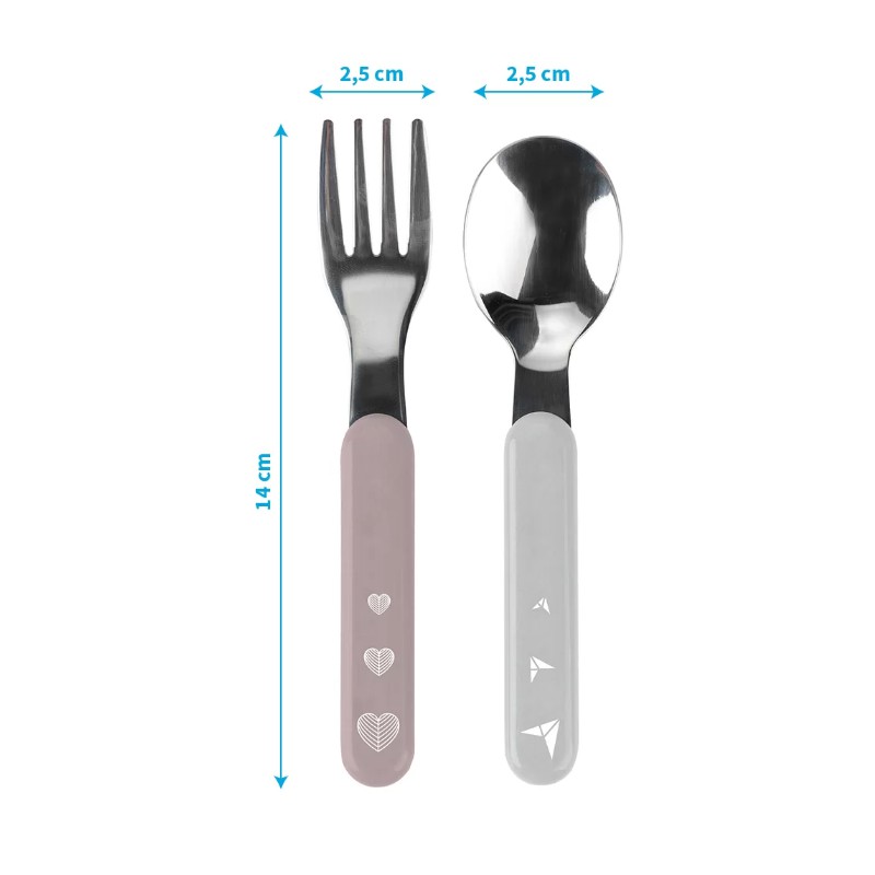 Zestaw sztućców wykonany ze stali nierdzewnej bardzo przydaje się podczas nauki samodzielnego jedzenia. Ich wielkość została dopasowana do małych rąk dziecka. Widelczyk oraz łyżeczka wykonane są z wysokiej jakości stali nierdzewnej. Sztućce wykonane zostały z bezpiecznych materiałów, nie zawierających Bisfenolu A.