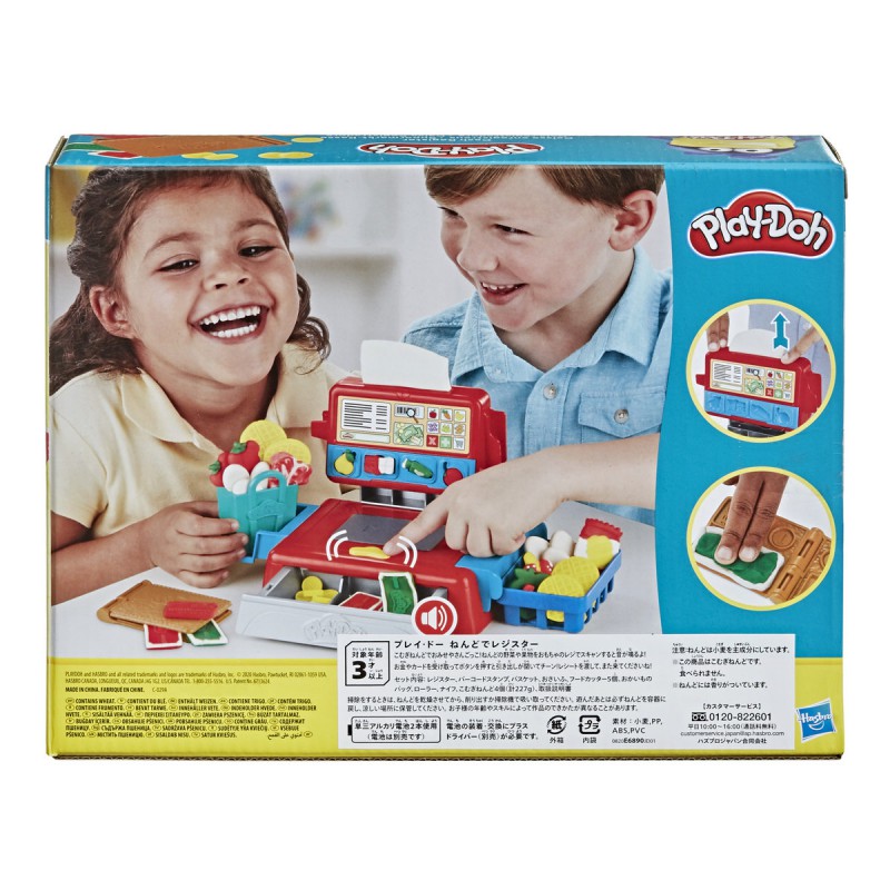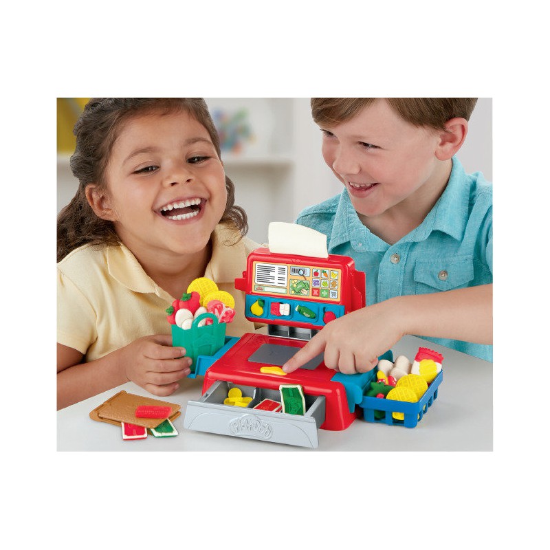 Ciastolina Kasa sklepowa E6890. Dzieci mogą bawić się w sklepikarza w stylu Play-Doh na klasycznej kasie! Za pomocą ręcznego skanera wytłaczaj kod kreskowy, a następnie „zeskanuj” go w kasie fiskalnej wydającej dźwięki. Wyciśnij z ciastoliny kartę kredytową, banknoty i monety i umieść je w szufladzie kasy. Szuflada naprawdę się otwiera i zamyka. Wydrukuj paragon i włóż go do torby z zakupami. W zestawie 5 foremek w kształcie artykułów spożywczych, foremka-portfel, koszyk na zakupy, torba i 4 standardowe tuby Play-Doh. Baterie nie są dołączone.