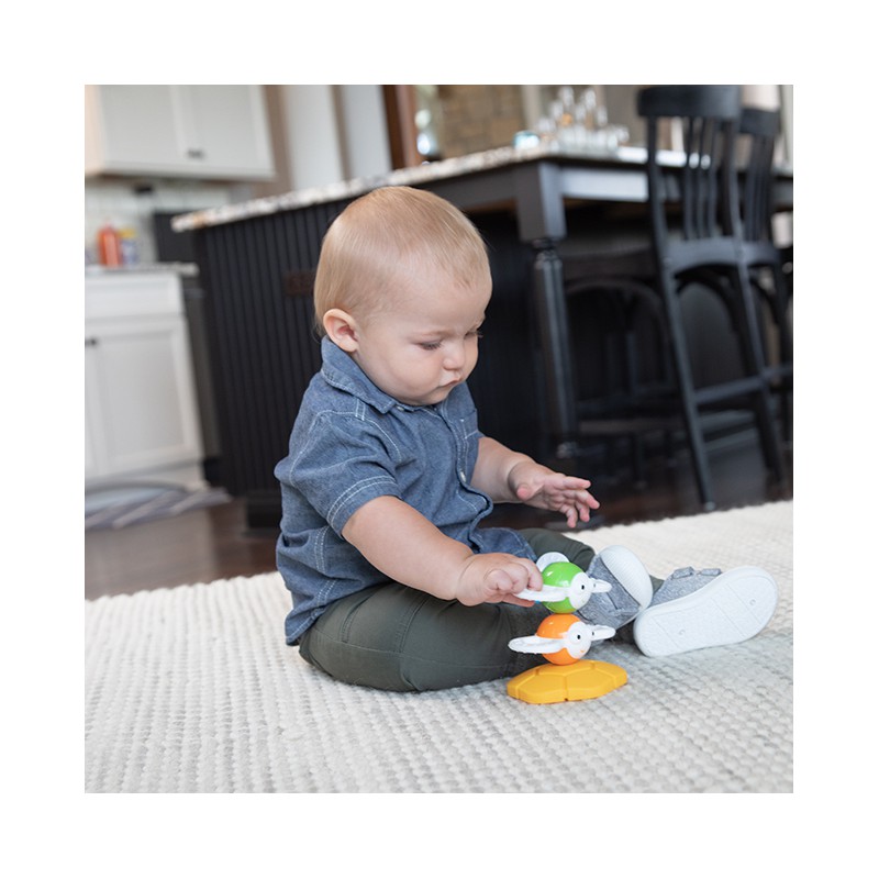 Silikonowe skrzydełka z wypustkami stymulują małe paluszki i łagodzą ból dziąseł, jasne kolory tych pracowitych owadów i ich duże, przyjazne oczy pobudzają wyobraźnię malucha.