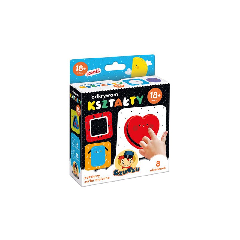 Zestaw 8 dużych, trwałych, dwuelementowych układanek to pomysł na pierwszy puzzlowy sorter dla malucha. Zabawa polega na dopasowywaniu figur do odpowiednich dziurek. To świetny pomysł na rozwijanie małej motoryki oraz poznawanie kolorów i kształtów.