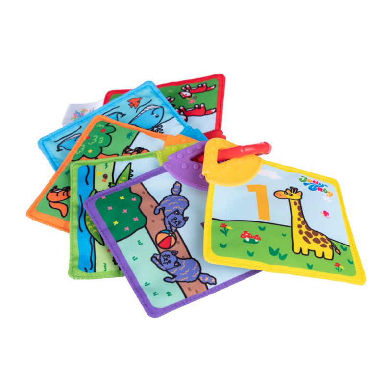 Składa się ona z sześciu dwustronnych, materiałowych kart, a każda z nich posiada w rogu praktyczny gryzaczek, który przyniesie ulgę w ząbkowaniu. Szeleszczące elementy i miłe dla oka obrazki zapewnią maluszkowi zajęcie, stymulując przy tym jego zmysły i wpływając pozytywnie na jego rozwój. Poszczególne strony połączone są w całość za pomocą kółeczka, które można przyczepić w wybranym miejscu.