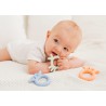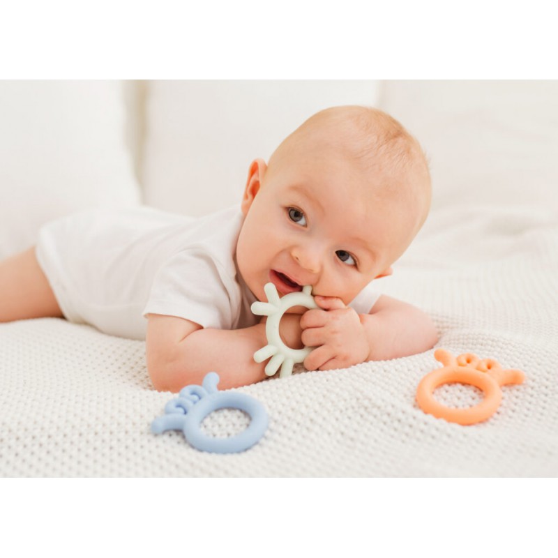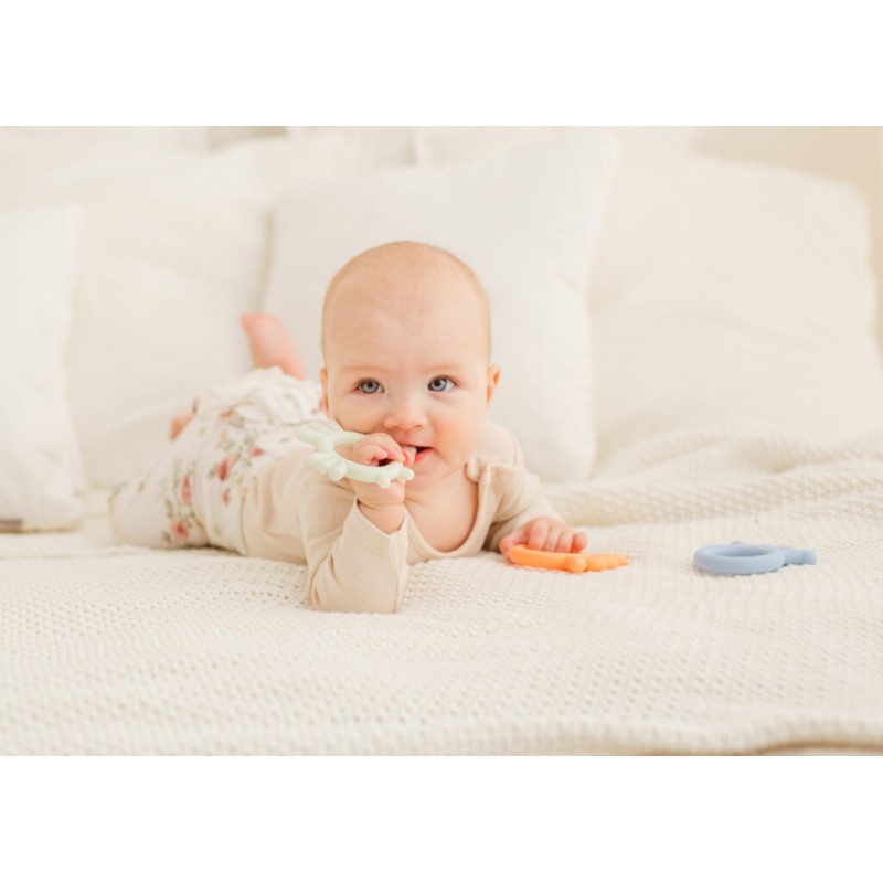 Silikonowy gryzak w kształcie kurczaka sprawdzi się idealnie u każdego ząbkującego maluszka. Jego zróżnicowana powierzchnia sprawia, że podczas gryzienia, delikatnie masuje on obolałe dziąsła dziecka. Kształt kurczaka jest idealnie dostosowany do małych rączek, co ułatwia jego chwytanie. Śliczny, pastelowy kolor czyni gryzak także stylowym dodatkiem dla każdego modnego bobasa.