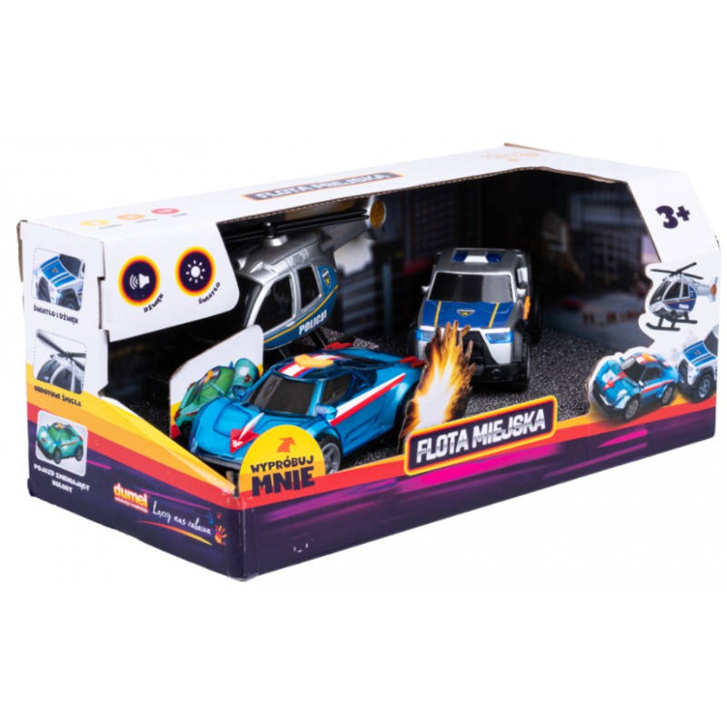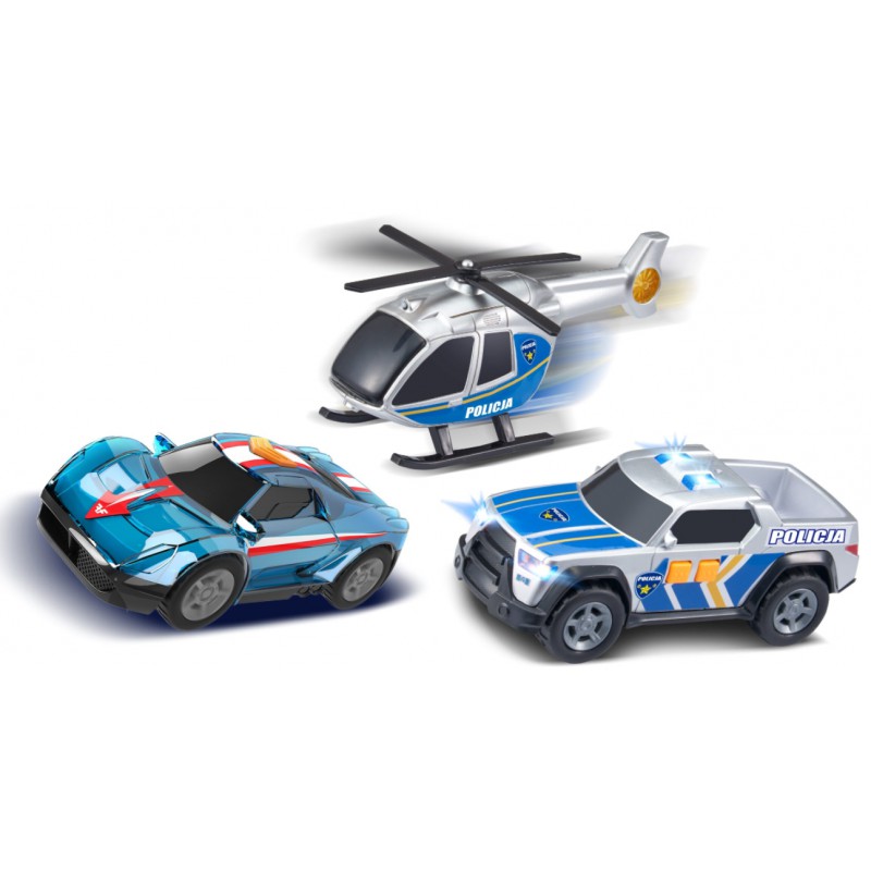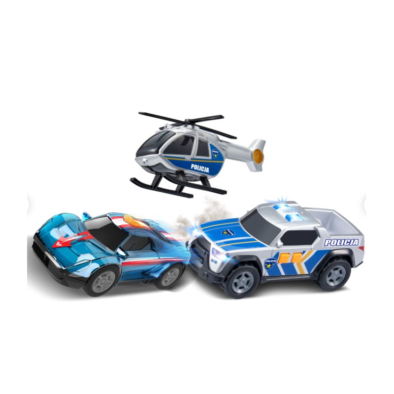 – w zestawie: pojazd zmieniający kolor, helikopter z ruchomymi śmigłami i samochód policyjny, który wydaje realistyczne odgłosy i świeci