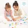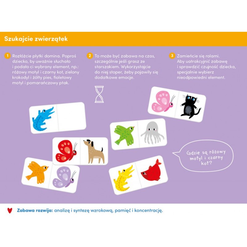 To jednocześnie układanka i gra, która rośnie razem z dziećmi. Elementy można łączyć na różne sposoby: kolorami, zwierzętami, kolorami i zwierzątkami lub tradycyjnymi oczkami. Zagrajcie razem w klasyczne domino lub łączcie kolorowe, duże elementy, poznając przy tym kolory i trenując spostrzegawczość i logiczne myślenie. Dostosujcie poziom trudności zabawy do rozwijających się umiejętności dzieci. Mnóstwo pomysłów na edukacyjne zabawy znajdziecie w poradniku dołączonym do zestawu!