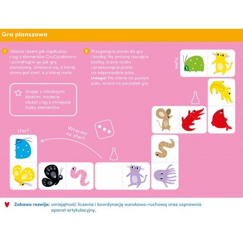 CzuCzu domino rośnie razem z dziećmi, dlatego polecamy je graczom w wieku od dwóch dwóch lat, a górnej granicy nie ma. Dostosujcie poziom trudności do rozwijających się umiejętności dziecka. Najmłodsi gracze mogą zacząć zabawę od dopasowywania dwóch elementów i układania coraz dłuższych ciągów. Nazywajcie zwierzątka i kolory na obrazkach. Starszaki mogą dopasowywać elementy z taką samą liczbą oczek. Zabawa to przyjemny sposób na rozwijanie różnych umiejętności, poznawanie nowych słów oraz spędzanie czasu razem. To też świetna okazja do nauki radzenia sobie z emocjami pojawiającymi się podczas gry.