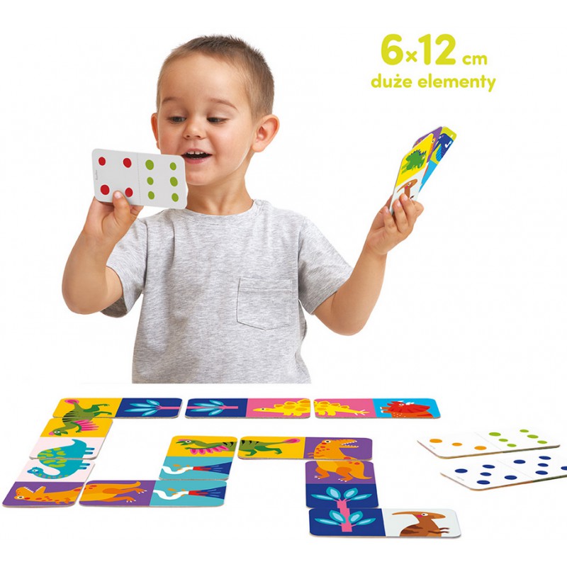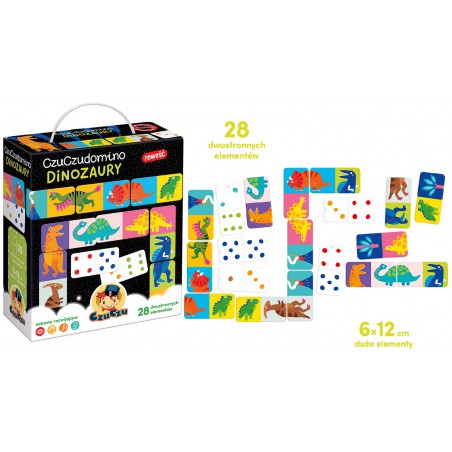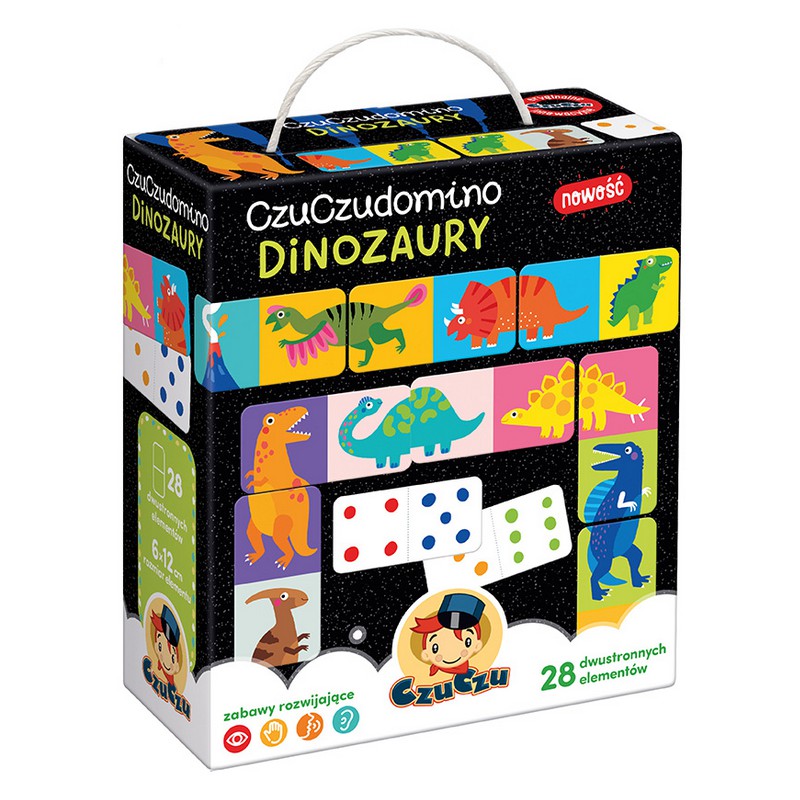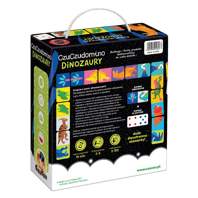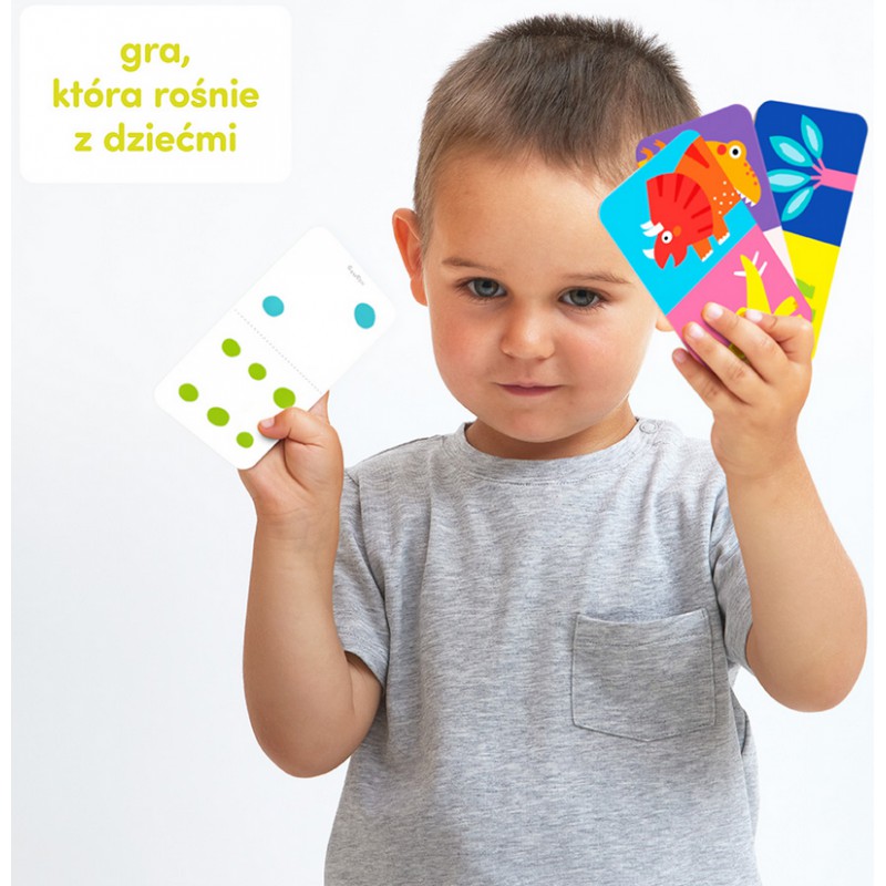 Razem z dinozaurami! CzuCzu domino rośnie razem z dziećmi, dlatego polecamy je graczom już od dwóch lat. Możecie łatwo dostosować poziom trudności do umiejętności dziecka. Najmłodsi gracze mogą zacząć zabawę od dopasowywania dwóch elementów z połówkami ilustracji lub takimi samymi obrazkami. Następnie układajcie razem coraz dłuższe “węże”.