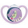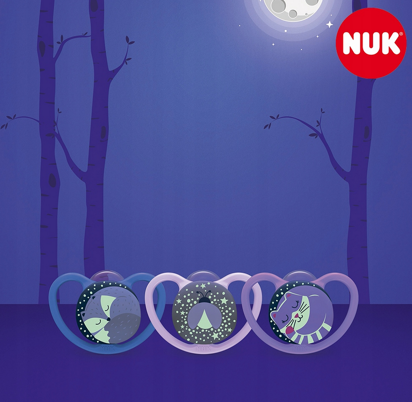 Smoczek uspokajający z kolekcji SPACE NIGHT charakteryzuje się dużymi otworami wentylacyjnymi, które zapewniają lepszą cyrkulację powietrza. Unikalny kształt jest wzorowany na brodawce sutkowej i wspiera zdrowy rozwój jamy ustnej dziecka. Emitują w ciemności łagodne światło i można je z łatwością znaleźć nawet w nocy.