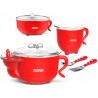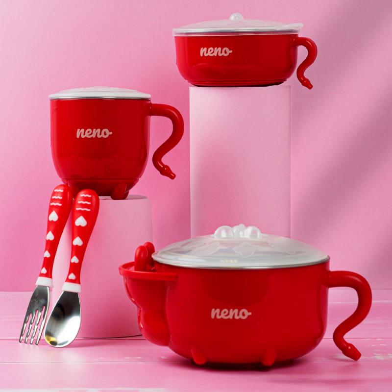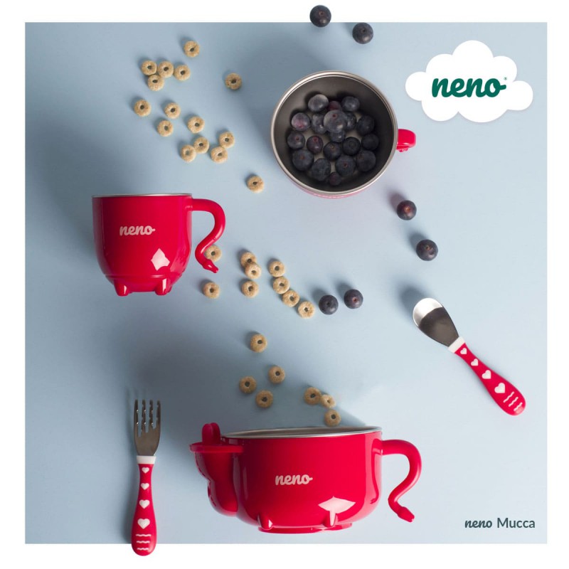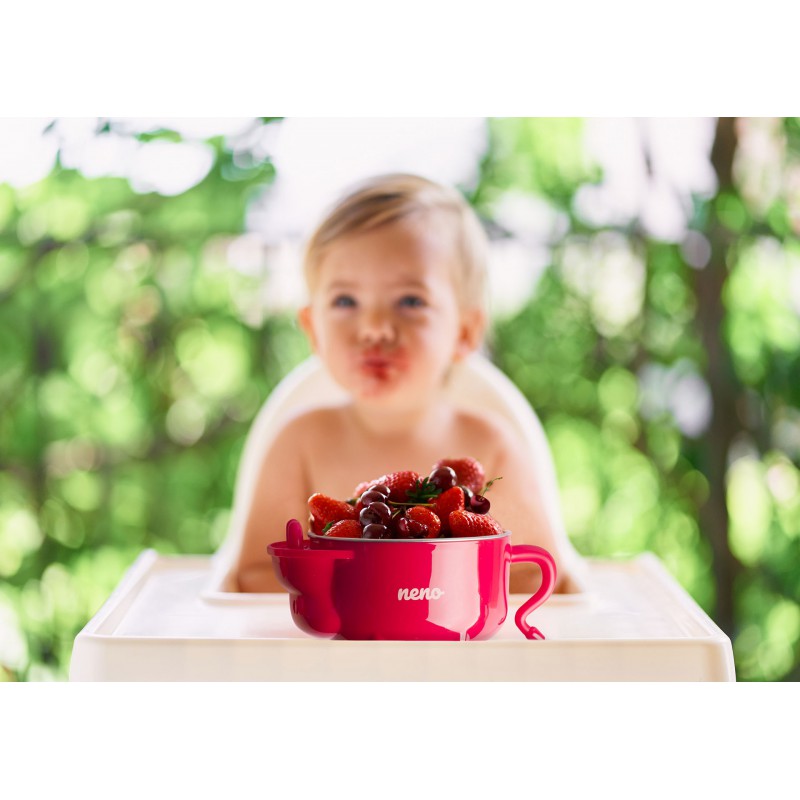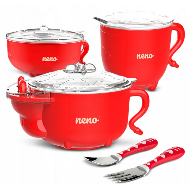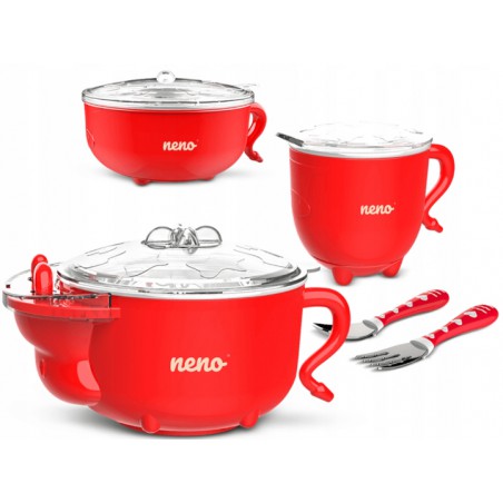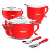 Zawartość zestawu: Duża miska, mała miska, kubek, widelec, łyżka, przyssawka antypoślizgowa x2, zatyczka do wlewu wody, duża pokrywka z odpowietrznikiem, mała pokrywka, pokrywka na kubek
