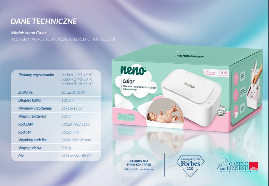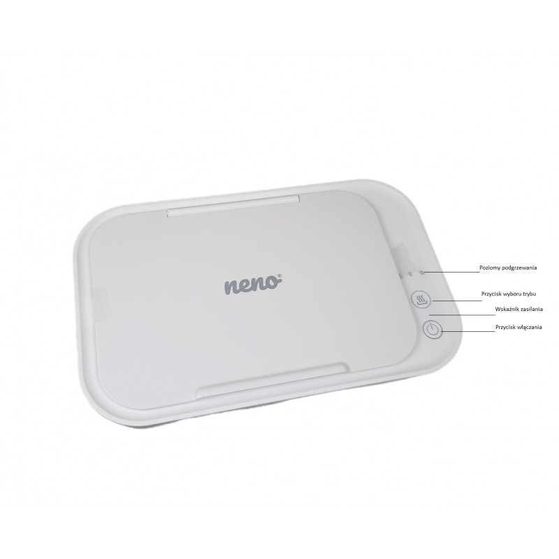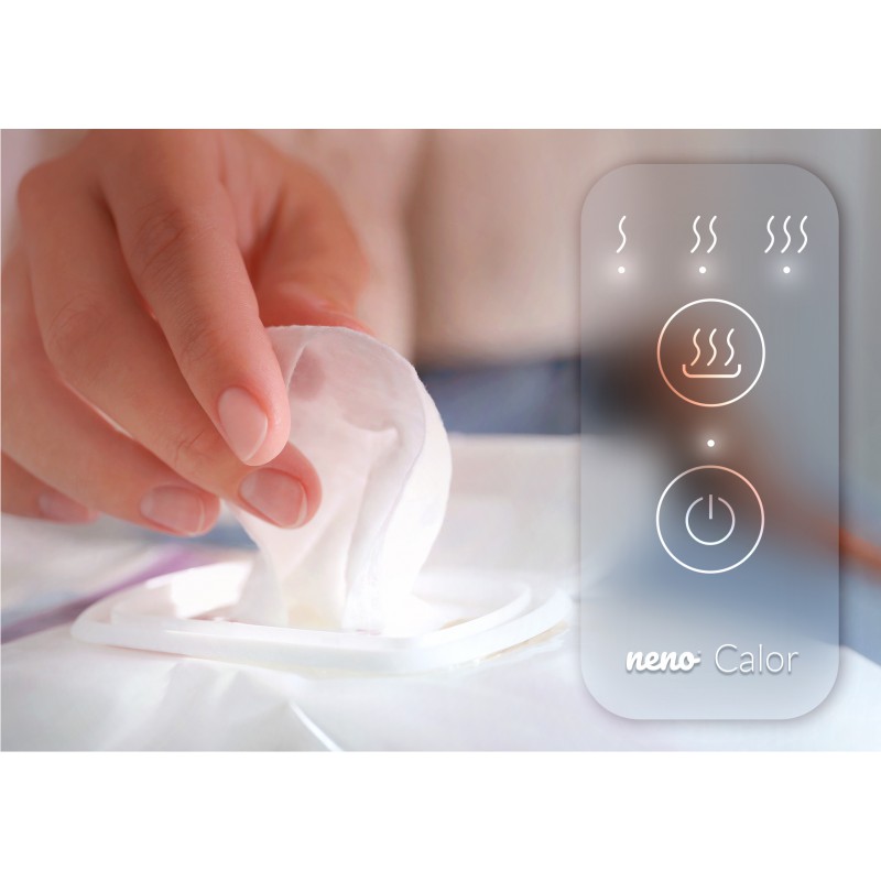 - Nowoczesna technologia w Neno Calor sprawia, że chusteczki pozostają wilgotne, nie brązowieją i nie tracą temperatury. Wbudowana w obudowę cienka grzałka oraz trzy poziomy nagrzewania pozwolą Ci podgrzać i utrzymać temperaturę chusteczek, aby były zawsze gotowe do użycia. Wystarczy włożyć wtyczkę do gniazdka, wybrać temperaturę grzania i gotowe.