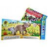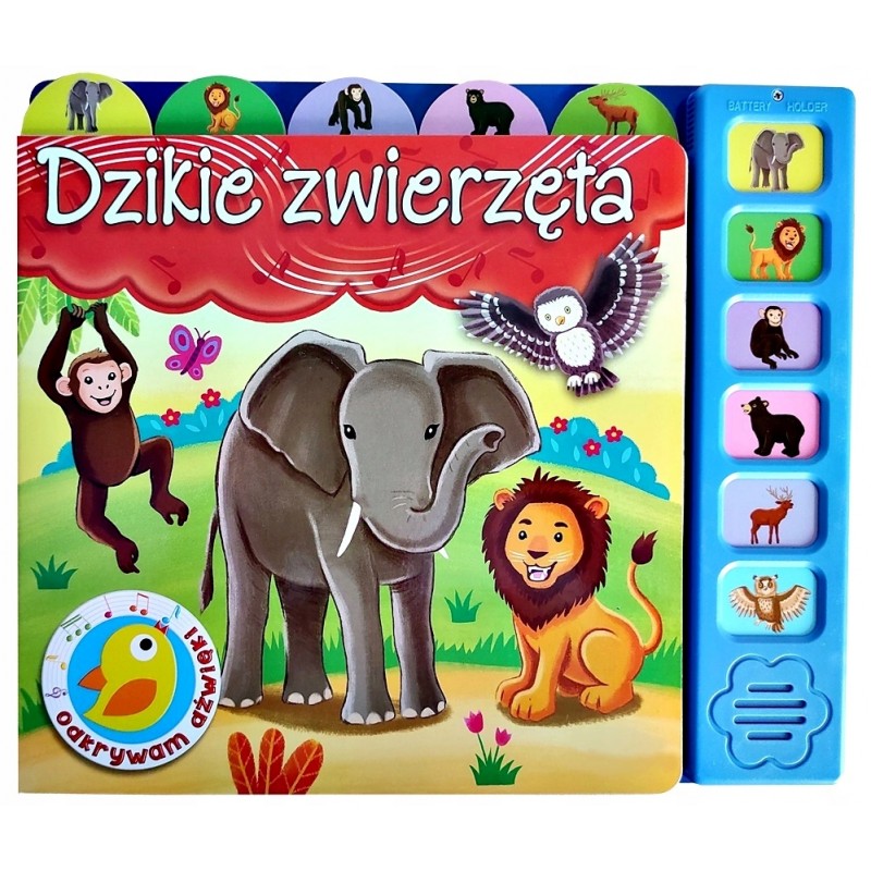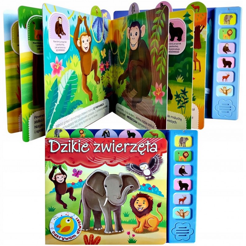 Dzikie Zwierzęta- książeczka z dźwiękami zawiera krótkie scenki rodzajowe, których bohaterami są dzikie zwierzęta. Do każdej historyjki jest dopasowany przycisk dźwiękowy - po jego naciśnięciu dziecko usłyszy dźwięki np. trąbienie słonia czy ryczenie lwa. Książeczka wyposażona jest w kolorowe wypustki z obrazkami dzięki którym można łatwo otworzyć książkę na wybranym dźwięku.