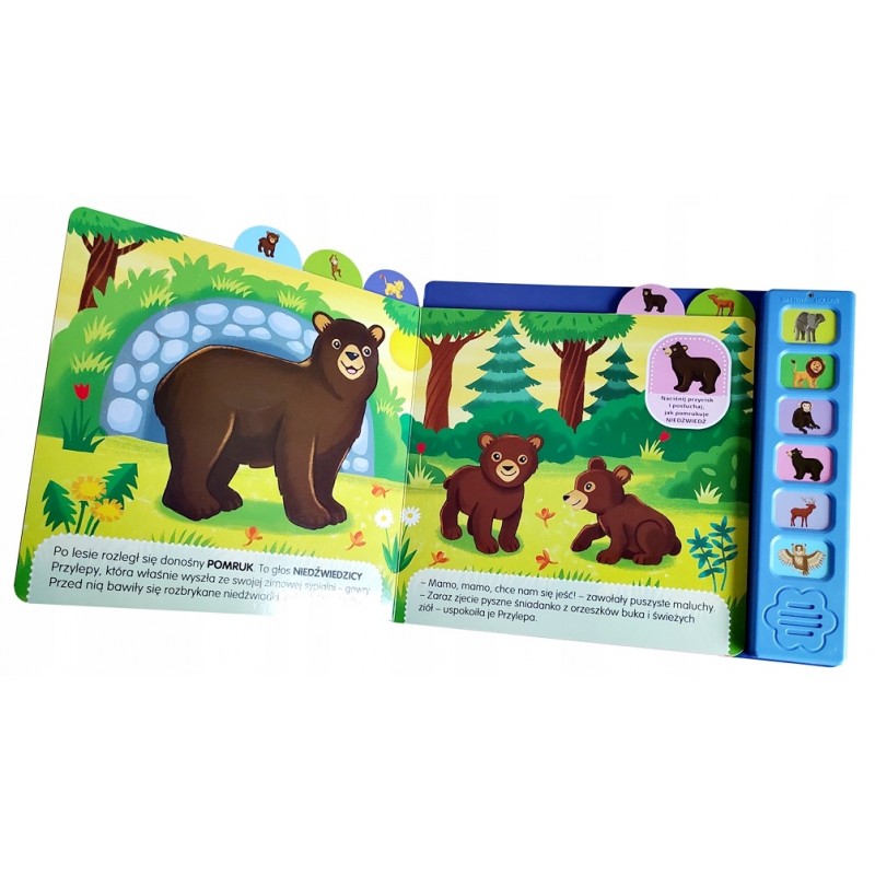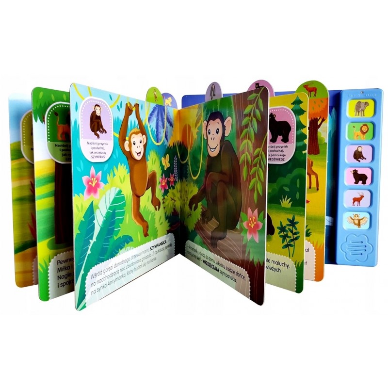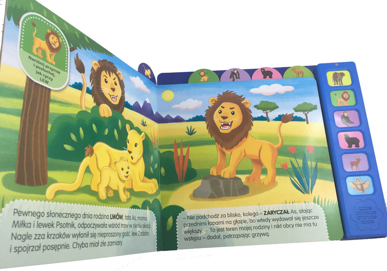 - Do każdej historyjki jest dopasowany przycisk dźwiękowy - po jego naciśnięciu maluszek usłyszy dźwięki np. trąbienie słonia czy ryczenie lwa.
