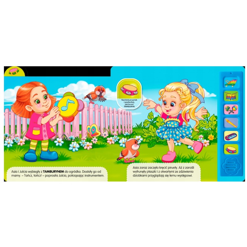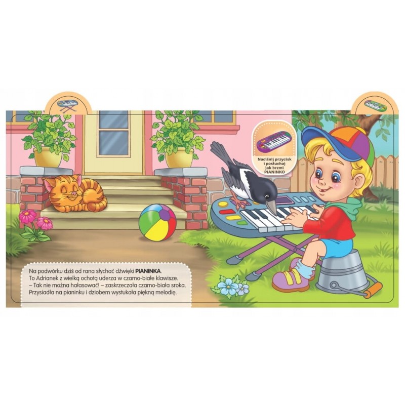 - Publikacja zawiera krótkie SCENKI RODZAJOWE, których bohaterami są Ludzie oraz MUZYKA. Do każdej historyjki jest dopasowany PRZYCISK DŹWIĘKOWY. Po jego naciśnięciu maluszek usłyszy dźwięki np. FLETU lub BĘBENKA. Atutem książki są również KOLOROWE WYPUSTKI z obrazkami przedstawiające instrumenty. Dzięki nim można łatwo otworzyć książkę na wybranym dźwięku.