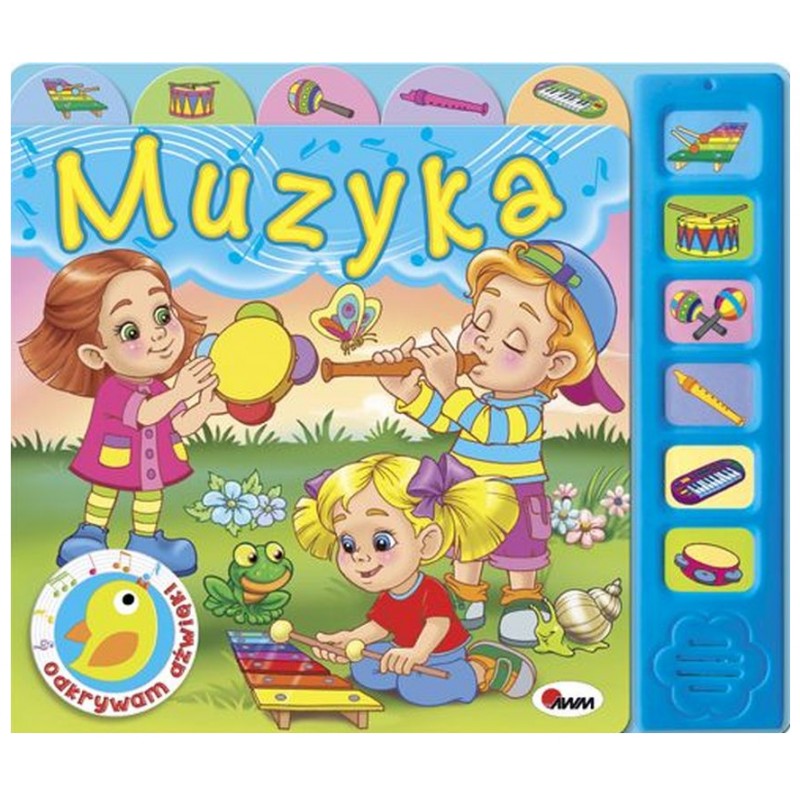 Muzyka- książeczka z dźwiękami zawiera krótkie scenki rodzajowe, których bohaterami są ludzie oraz muzyka. Do każdej historyjki jest dopasowany PRZYCISK DŹWIĘKOWY. Po jego naciśnięciu maluszek usłyszy dźwięki np. FLETU lub BĘBENKA. Książeczka wyposażona jest w kolorowe wypustki z obrazkami dzięki którym można łatwo otworzyć książkę na wybranym dźwięku.