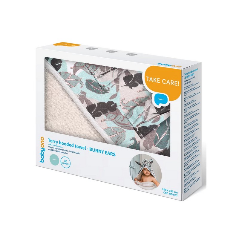 Zapakowane w ozdobny kartonik miękkie okrycie kąpielowe od Babyono z uszkami królika – zapewni komfort wrażliwej skórze małego dziecka po kąpieli. Okrycie świetnie wchłania wilgoć i chroni dziecko przed wychłodzeniem.