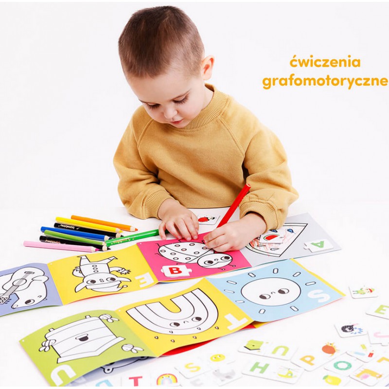 W edukacyjnym zestawie znajdziecie 2 książeczki do kolorowania i zestaw dwuelementowych puzzli z literami. Kolorowe ilustracje zachęcą dzieci do zabawy na różne sposoby i rozwijanie małej motoryki, poznawanie liter i nowych słów.