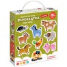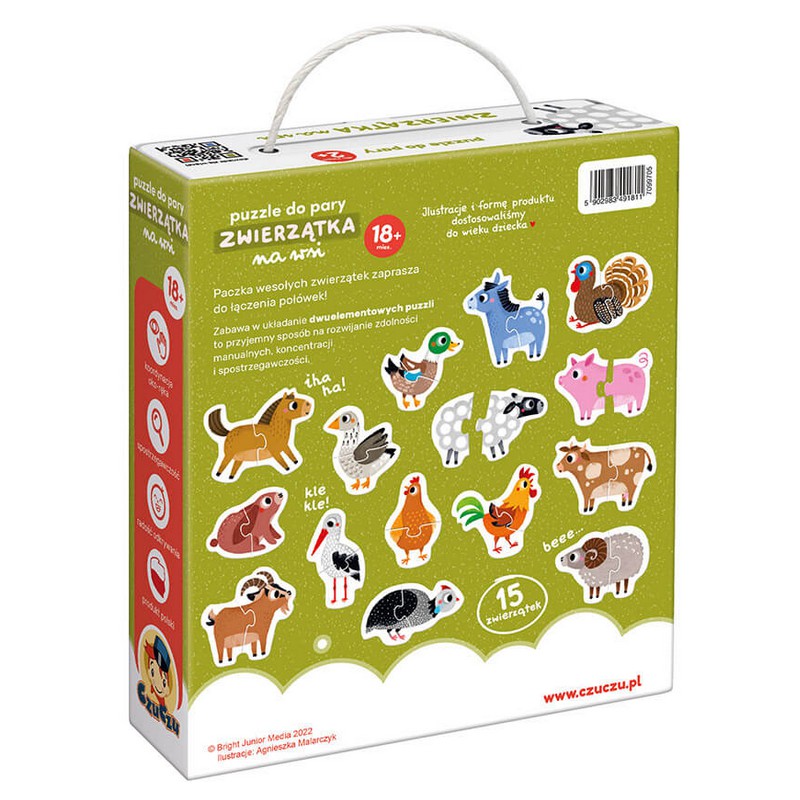 W poręcznym pudełku zamieszkało aż 15 uroczych zwierzaków z gospodarstwa. Każdy składa się z 2 dużych elementów. Forma puzzli i piękne ilustracje sprawiają, że zestaw doskonale sprawdzi się jako pierwsze puzzle dla malucha. Fantastycznie sprawdzają się w domu, żłobku i podróży. Puzzle inspirują do wielu różnorodnych zabaw.