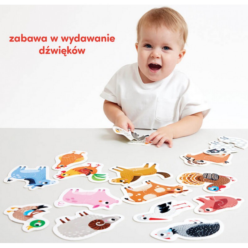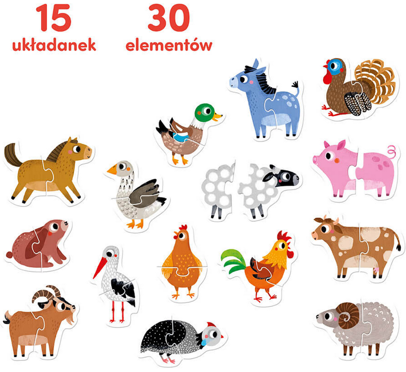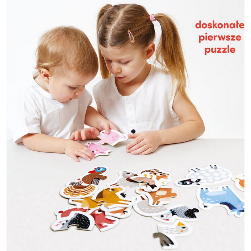 Zestaw dwuelementowych puzzli zawierających postacie zwierzątek z gospodarstwa doskonale sprawdzą się jako pierwsze puzzle malucha. Duże i trwałe elementy dopasowane do małych rączek zachęcą maluszka do zabawy doskonaląc przy tym różne umiejętności.