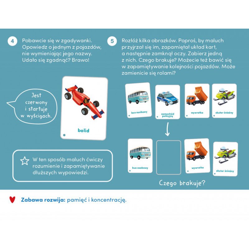 Edukacyjna książeczka z 32 pięknymi ilustracjami pojazdów to doskonały pomysł na prezent dla najmłodszych miłośników motoryzacji. Kolorowe maszyny to świetny pretekst do zabaw w nazywanie, grupowanie czy naśladowanie dźwięków. Poręczny format i łączenie sznureczkiem sprawiają, że kartami można bawić się na mnóstwo kreatywnych sposobów.