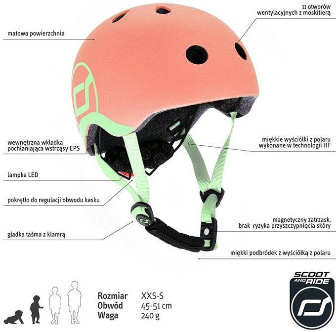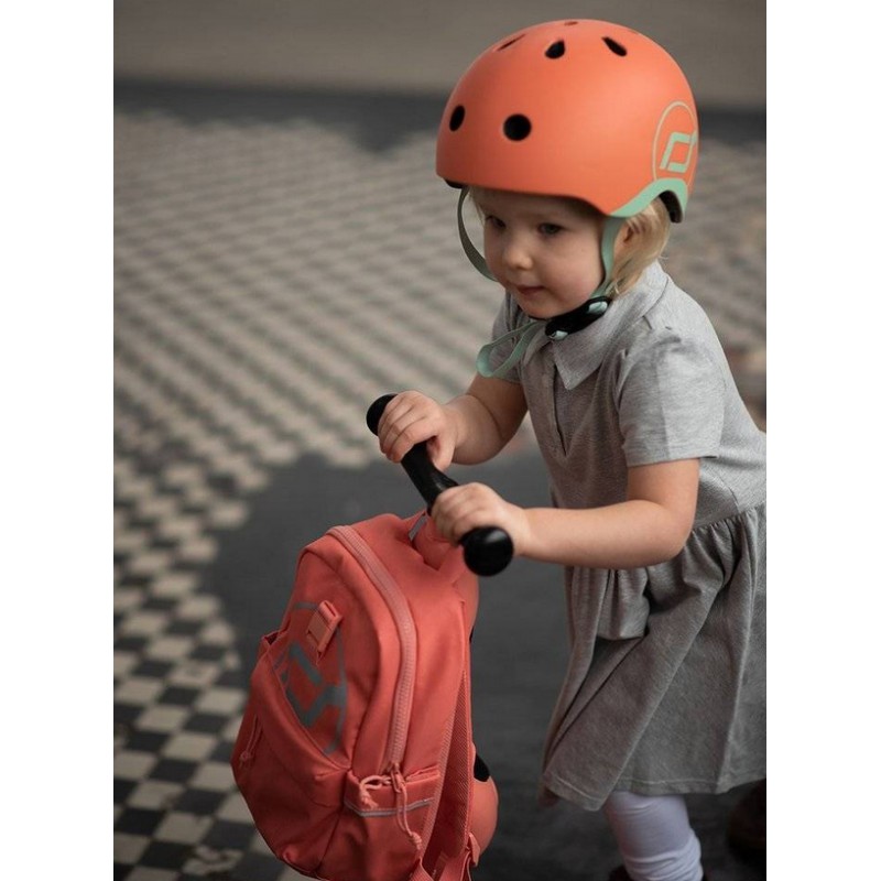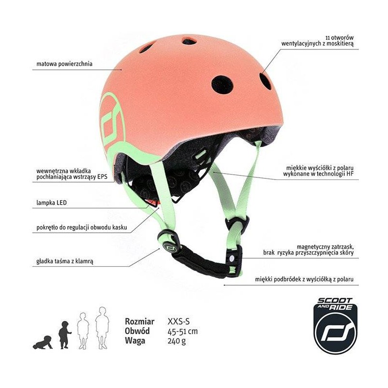 Ultralekki dziecięcy kask ochronny SCOOTANDRIDE dedykowany dzieciom od 1 do 5 roku życia. Regulowany za pomocą pokrętła z tyłu, wyposażony w czerwoną lampkę LED z trzema trybami świecenia, oraz bezpieczne magnetycznie zapięcie pod szyją z polarowym podbródkiem zapewniającym dodatkową ochronę.