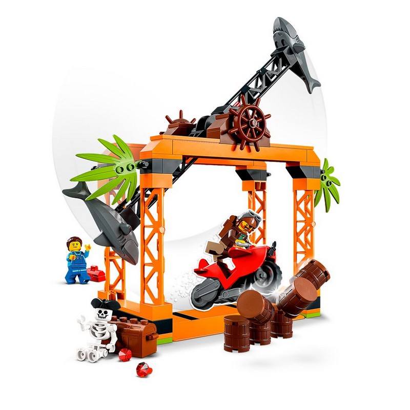 Zestaw LEGO City Wyzwanie kaskaderskie: atak rekina (60342) gwarantuje dzieciom pełną akcji zabawę. Wystarczy uruchomić motocykl z kołem zamachowym, ominąć szkielet i obracające się koło z rekinami oraz trafić w beczki, by dostać się do ukrytej skrzyni z pirackim skarbem. Dodatkowo dwie minifigurki, w tym Chuck D. Goldberg z serialu telewizyjnego LEGO City, gwarantują długie godziny pomysłowej zabawy w odgrywanie ról.