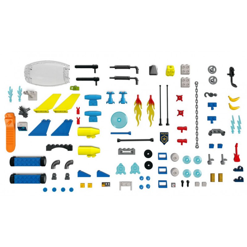 - Mnóstwo akcesoriów do wykonywania misji — akcesoria dla minifigurek obejmują sprzęt do nurkowania, szkło powiększające, kamizelkę ratunkową, krótkofalówkę, lornetkę, kajdanki, aparat i skarb.