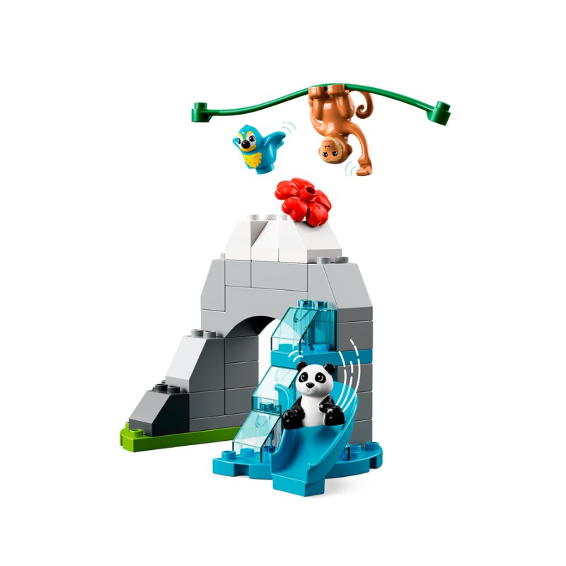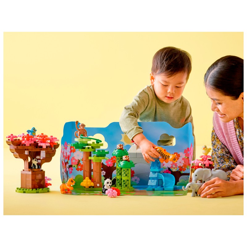 Wszyscy mali miłośnicy zwierząt będą zachwyceni nieograniczonymi możliwościami zabawy, które daje ten zestaw z wieloma dzikimi azjatyckimi zwierzętami. Można tu spotkać słonia i słoniątko, dużą i małą pandę, tygrysa i tygrysiątko, małpę, dwa ptaki oraz dwie pandy czerwone. W zestawie są również bambusy, drzewa wiśniowe i składana trójwymiarowa plansza, a nawet klocek odtwarzający realistyczne dźwięki i odgłosy zwierząt.