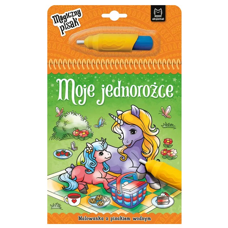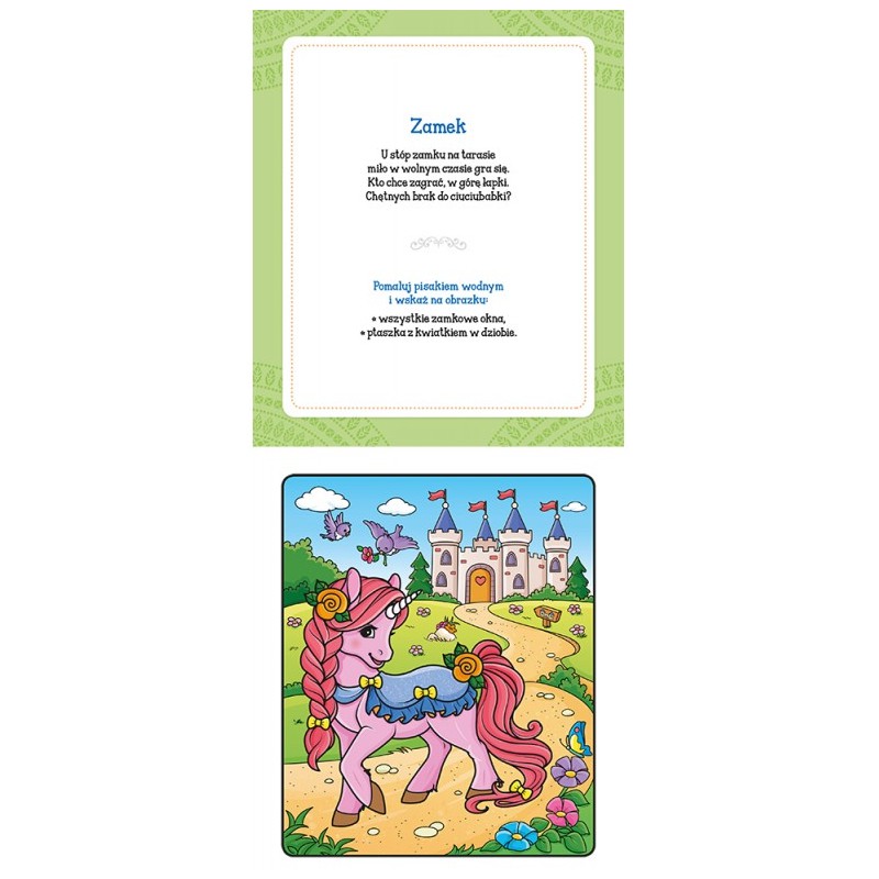 Maluj wodą! Kształty, kolory i obrazy pojawią się za każdym pociągnięciem pisaka. Dołączony do książki pisak wystarczy napełnić wodą i można już rozpocząć zabawę – na zwilżonych mokrym pędzelkiem stronach pojawią się kolorowe ilustracje. Znikną, kiedy strona wyschnie. Książką można bawić się wiele razy. Po zabawie należy wylać wodę z pisaka i schować go do opakowania.