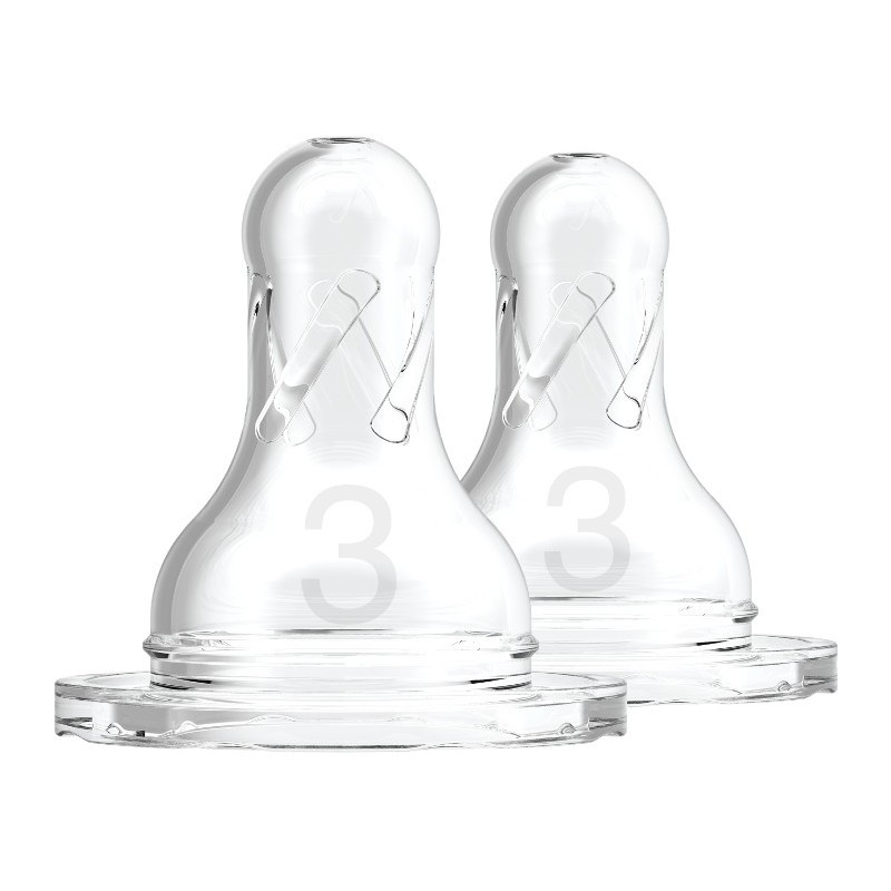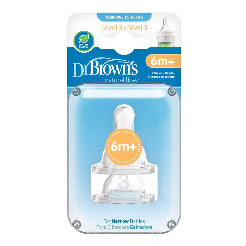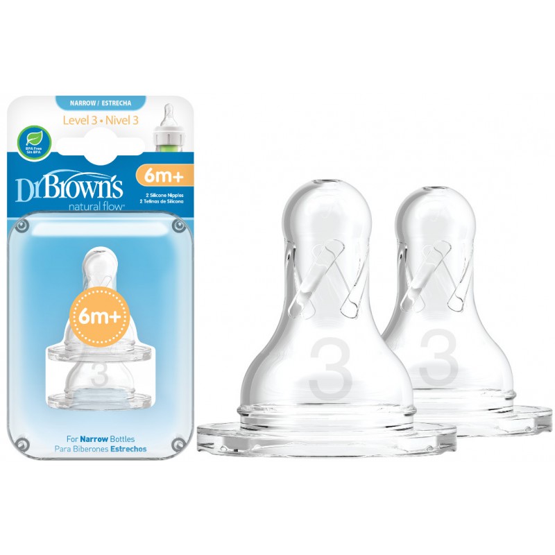 Smoczek Dr Brown′s Poziom 3 zapewnia spójny, naturalny, powolny przepływ. Kształtem przypomina pierś matki. Wykonany z najwyższej jakości super miękkiego silikonu. W połączeniu z systemem antykolkowym powoduje bezciśnieniowe karmienie, które zmniejsza występowanie kolek, odbijania oraz gazów. Smoczek pasuje do wszystkich wąskich butelek Dr Brown′s. W opakowaniu znajdują się 2 smoczki. Można myć w zmywarce na górnej półce. Przeznaczony dla dzieci powyżej 6 miesięcy.