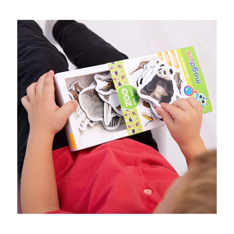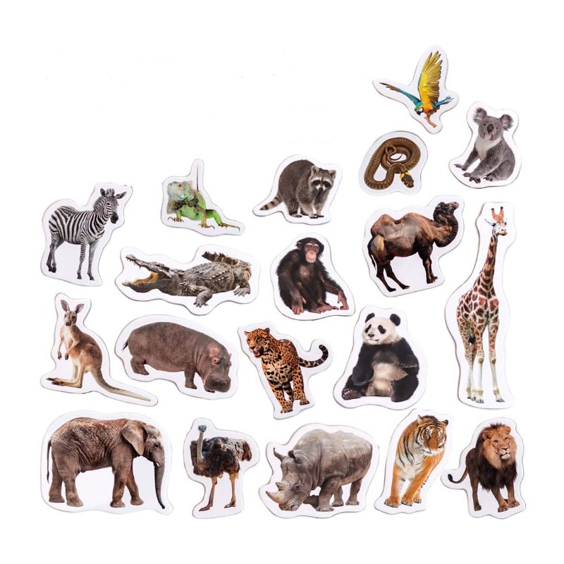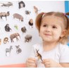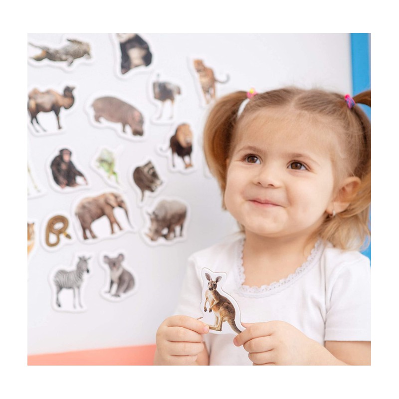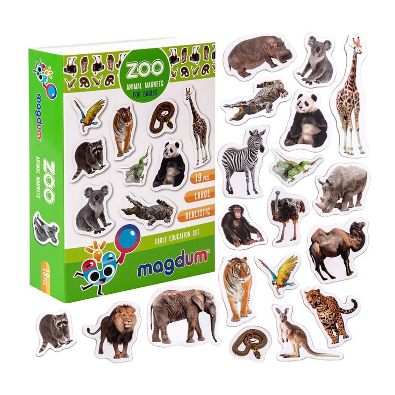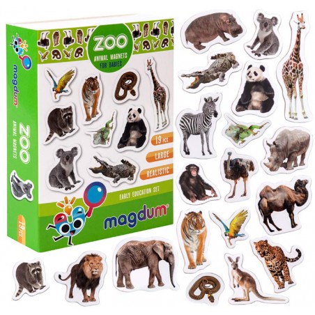 W zestawie znajduje się 19 dużych, grubych-3mm, realistycznych magnesów o zaokrąglonych krawędziach. Magnesy można kategoryzować, grupować, układać według rozmiaru, ucząc się przy tym nazw zwierząt. Cechy: magnesy są praktyczne i wygodne, laminowane, wielkość największego magnesu: 7,1cm