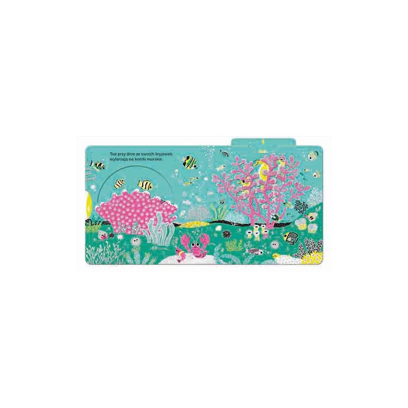 Książeczka Ocean przenosi czytelnika w podwodny świat morski. Pokazuje barwny bal pływających meduz, delfinów, żółwi i koników morskich.